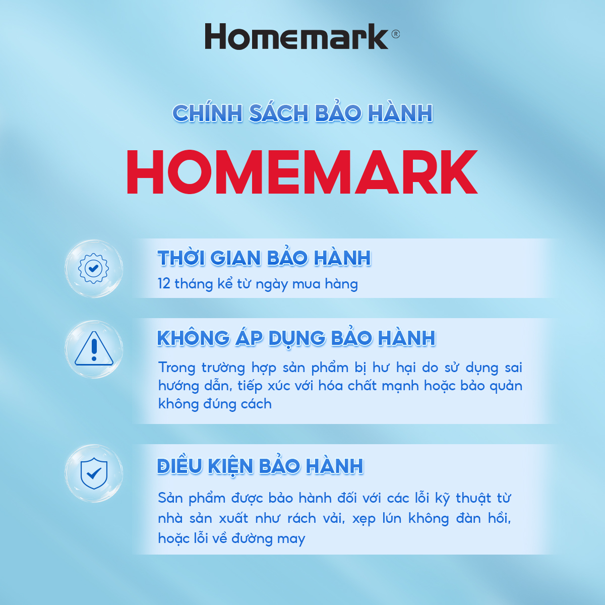 - Điều kiện bảo hành: Sản phẩm được bảo hành đối với các lỗi kỹ thuật từ nhà sản xuất như rách vải, xẹp lún không đàn hồi, hoặc lỗi về đường may.