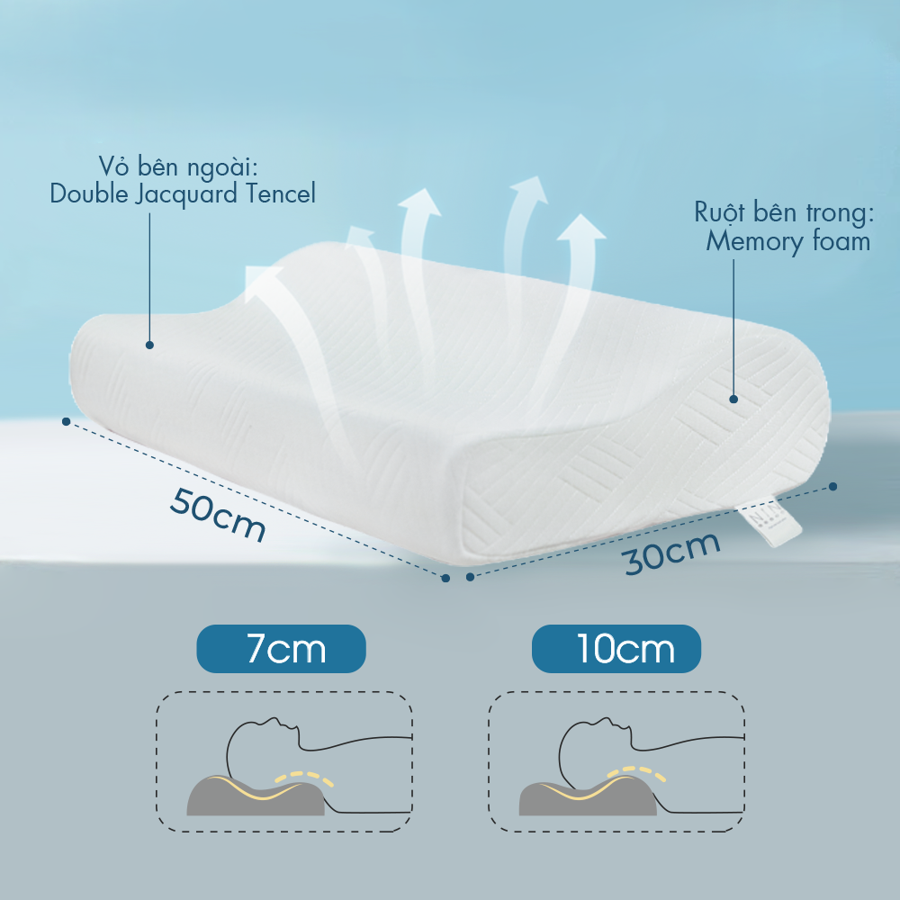 Mua tại TiktokKích thước: 50 x 30 x 10/7cm Chất liệu: Vải bên ngoài: Double Jacquard Tencel Siêu mềm mại và êm ái: giúp mang lại cảm giác mềm mại và êm ái, giúp người dùng nhanh chóng đi vào giấc ngủ ngon và sâu. Điều chỉnh độ cao/thấp phù hợp với người dùng Cố định cổ đúng vị trí: nhờ chức năng đàn hồi vừa phải, giúp ôm sát đầu, cổ, vai gáy giúp người dùng nằm đúng tư thế, hạn chế đau cổ vai gáy do việc nằm sai tư thế. Hỗ trợ điều trị các bệnh về đau cột sống cổ, xương khớp và cơ vùng vai cổ. Hỗ trợ điều trị các bệnh về đau cột sống cổ, xương khớp và cơ bắp vùng cổ. Hướng dẫn sử dung: ♫ Chỉ giặt lớp vải bên ngoài với nước xả vải, không dùng chất giặt tẩy mạnh ♫ Không giặt lớp mút bên trong.