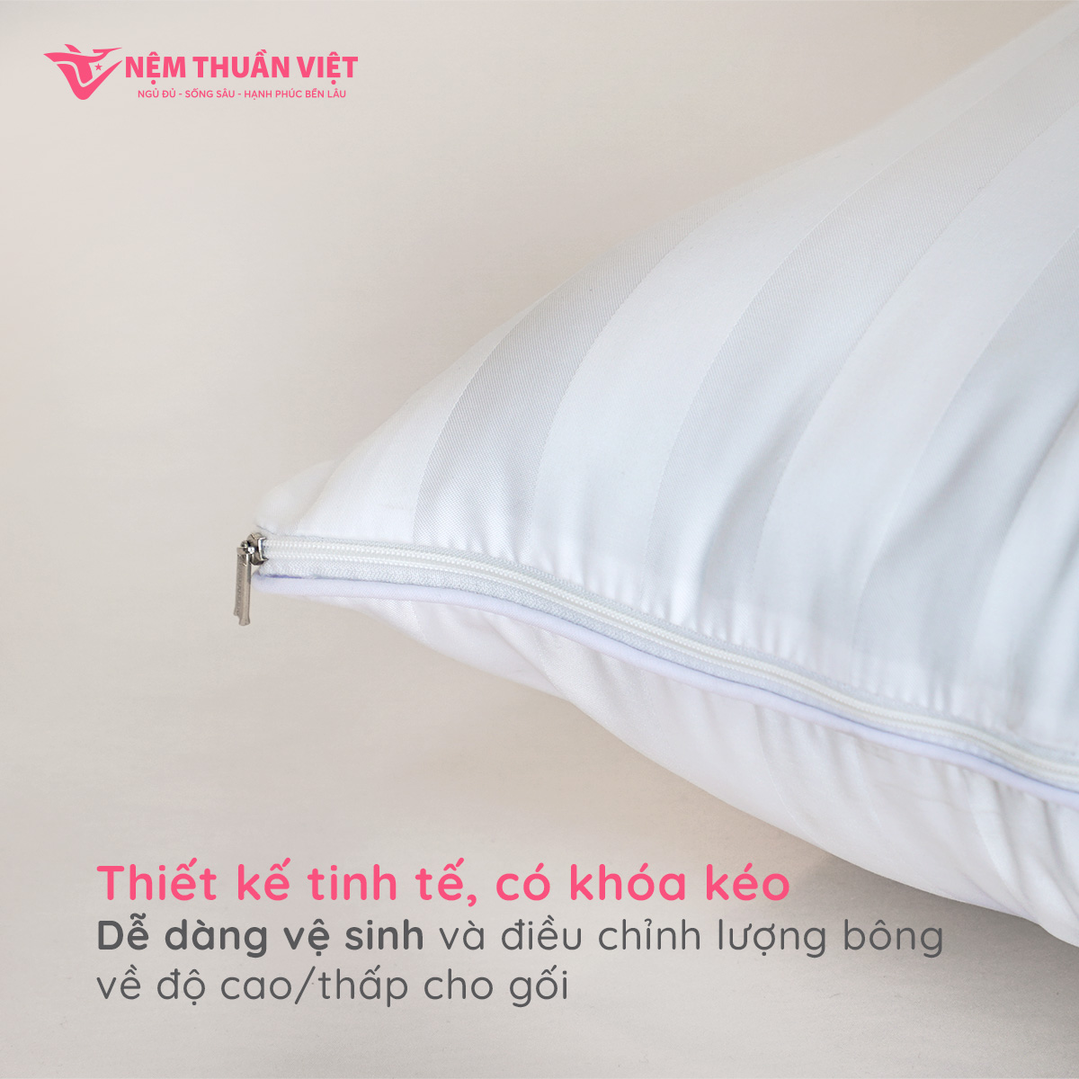 - Thiết kế tinh tế, có khóa kéo Gối có khóa kéo tiện lợi, người nằm có thể điều chỉnh lượng bông về độ cao/thấp cho gối, mang lại tư thế gối đầu thoải mái và dễ chịu nhất.