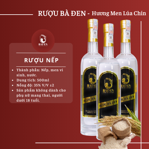 Rượu Nếp Bà Đen chai thủy tinh 500ml với nguyên liệu chính là nếp chọn lọc đạt chất lượng được nấu chín kết hợp với men vi sinh .