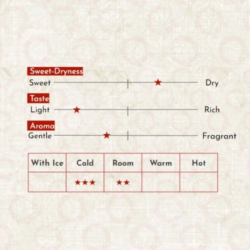 Xuất xứ: Nhật Bản Nồng độ cồn: 15% Thành phần: Lên men từ nước, gạo (nội địa Nhật), men gạo Koji (nội địa Nhật) Hướng dẫn sử dụng: Có thể uống tại nhiệt độ phòng 15 - 20 độ.