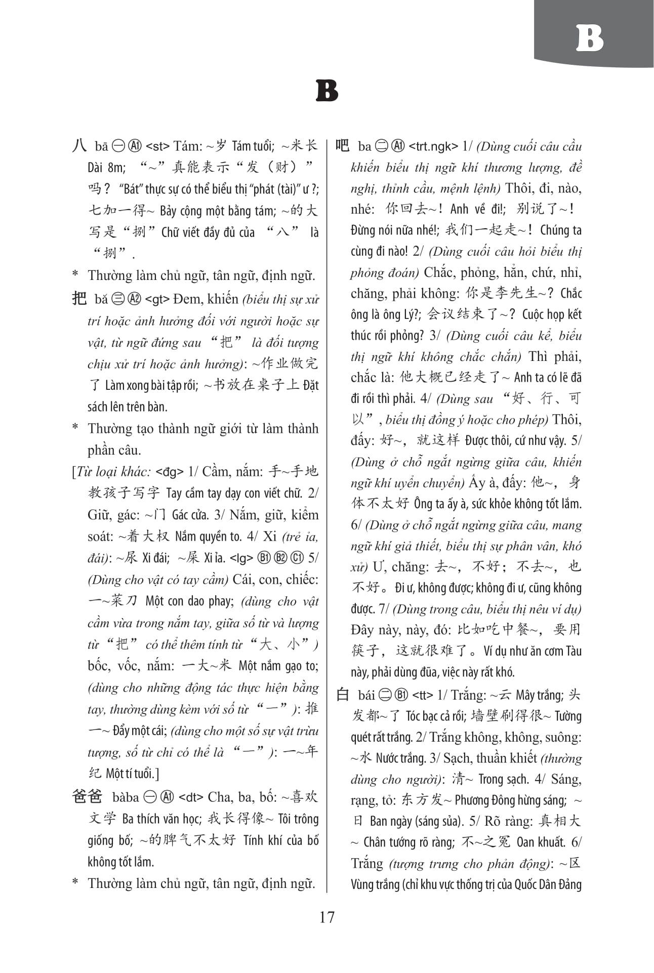 1.Sổ tay từ vựng HSK1-2-3-4 và TOCFL band A Công ty phát hành Công ty TNHH Giáo Dục Hải Hà Ngày xuất bản 12-2020 Loại bìa Bìa mềm Số trang 264 SKU 8922808657289 Nhà xuất bản Đại Học Sư Phạm TPHCM Nắm vững được nhiều từ vựng là một yêu cầu căn bản nhất khi học ngoại ngữ nói chung cũng như thi HSK, TOCFL nói riêng. Có hai điều khó khi học từ vựng: khó nhớ và khó vận dụng. Khó nhớ vì số lượng từ vựng rất lớn, đôi khi một từ có thể có rất nhiều nghĩa nên mặc dù người học đã bỏ nhiều thời gian và công sức nhưng học rồi lại quên hoặc chỉ nhớ được mang máng. Điều này dẫn đến khó khăn tiếp theo là người học sẽ không biết hoặc lúng túng trong việc vận dụng từ ngữ vào một ngữ cảnh cụ thể. Từ vựng, cho dù đã học, chỉ là từ “chết”. Bộ sách “Sổ tay từ vựng HSK - TOCFL” gồm hai cuốn - “HSK Cấp 1-2-3-4 & TOCFL Band A” và “HSK Cấp 5-6 & TOCFL Band B” sẽ giúp người học khắc phục được những khó khăn này. Những từ được chọn giới thiệu trong bộ sách được lấy từ bộ tài liệu “Đại cương thi trình độ Hán ngữ” các cấp của Văn phòng Hán ngữ Nhà nước Trung Quốc (Hanban) và “Bảng thuyết minh 8000 từ tiếng Hoa” (chỉ giới hạn ở từ vựng Band A và Band B) của Ủy ban Công tác Thúc đẩy Kỳ thi Năng lực Hoa ngữ Quốc gia (Đài Loan) (SC-TOP). Những tài liệu này là chuẩn mực quy định khung kiến thức cũng như mọi vấn đề liên quan đến kỳ thi HSK, TOCFL từng cấp độ, trong đó có từ vựng. Hai cuốn sổ tay từ vựng được biên soạn ở dạng một cuốn từ điển cách sử dụng từ đơn giản, lấy từ vựng HSK là chính, bổ sung thêm những từ vựng TOCFL (Band A & Band B) không thuộc bảng từ vựng HSK. Mỗi mục từ thường bao gồm những thông tin như sau: • Từ tiếng Hoa: Bao gồm từ dạng giản thể (HSK - Trung Quốc dùng) và từ dạng phồn thể/dị thể (TOCFL - Đài Loan dùng). Phần từ TOCFL trong dấu ngoặc đơn chủ yếu cung cấp thông tin về chữ dùng của Đài Loan (có khi là chữ dị thể khác với chữ phồn thể chuẩn của Trung Quốc). Những từ HSK không thuộc từ vựng TOCFL (Đài Loan dùng từ khác) hoặc những từ TOCFL không thuộc từ vựng HSK (Trung Quốc dùng từ khác) đều được chú thích ở phần ghi chú bên dưới. • Cấp độ HSK và TOCFL: Sách chủ yếu lấy từ vựng HSK là chính, bên cạnh ký hiệu chỉ cấp độ HSK của một từ sẽ có chú thích cấp độ TOCFL tương ứng của từ đó. Mặc dù bộ sách chỉ giới hạn từ vựng TOCFL đến Band B, nhưng có một số từ HSK có cấp độ TOCFL tương ứng thuộc Band C, chúng tôi vẫn sẽ ghi chú rõ ràng. Những từ TOCFL (Band A, Band B) không thuộc từ vựng HSK các cấp thì không có ký hiệu chỉ cấp độ HSK mà chỉ có ký hiệu chỉ cấp độ TOCFL. Ngoài ra, có những từ TOCFL thuộc Band A nhưng lại xuất hiện trong Bảng từ vựng HSK cấp 5-6, chúng tôi cũng sẽ đưa vào cuốn 1 (HSK cấp 1-2-3-4 & TOCFL Band A), tương tự đối với cuốn 2. • Phiên âm, từ loại, nghĩa từ và ví dụ cho từng nghĩa: Một từ có thể có nhiều âm đọc (từ đa âm), nhiều từ loại (từ kiêm loại), nhiều ý nghĩa (từ đa nghĩa). Phiên âm và từ loại của từ được nêu lên trong phần này đều căn cứ vào tài liệu “Đại cương thi trình độ Hán ngữ” của Hanban và “Bảng thuyết minh 8000 từ tiếng Hoa” của SC-TOP (thí sinh có thể tham khảo thêm từ loại khác và âm đọc khác của từ ở phần giải thích mở rộng bên dưới). Trường hợp Trung Quốc và Đài Loan có âm đọc khác nhau thì âm đọc của Đài Loan sẽ được đặt trong dấu ngoặc vuông bên cạnh âm đọc của Trung Quốc. Đối với từ đa nghĩa, chúng tôi sẽ ưu tiên nêu những nghĩa thường dùng nhất của từ, đồng thời cố gắng nêu đầy đủ ví dụ minh họa cho từng chức năng ngữ pháp của từ (làm chủ ngữ, vị ngữ, tân ngữ, định ngữ, trạng ngữ, bổ ngữ trong câu). • Sắc thái tình cảm và ngữ thể của từ (nếu có). • Chức năng ngữ pháp của từ và cách dùng đặc biệt của một số từ • Thành phần phụ phối hợp với từ: lượng từ phối hợp (đối với danh từ); có thể phối hợp với phương vị từ hay không (đối với danh từ chỉ nơi chốn); phó từ, trợ từ, động lượng từ, thời lượng từ, từ xu hướng và giới từ phối hợp (đối với động từ); trợ từ, thời lượng từ và từ xu hướng phối hợp (đối với tính từ). • Sự lặp lại của từ (đối với động từ, tính từ). • Câu chuyện thành ngữ (đối với một số thành ngữ). • Phân biệt từ đồng nghĩa (nếu có). • Ghi chú: Chú thích về những điểm khác nhau trong cách dùng từ, phân loại từ giữa Trung Quốc và Đài Loan. • Từ loại khác (nếu có): Đối với từ kiêm loại, ngoài từ loại đã được nêu lên ở phần giải thích chính, phần này sẽ cung cấp thêm thông tin về từ loại khác của từ, giải thích nghĩa từ (có ví dụ minh họa) thuộc từ loại đó. • Âm đọc khác (nếu có): Đối với từ đa âm, ngoài âm đọc đã được nêu ở phần giả