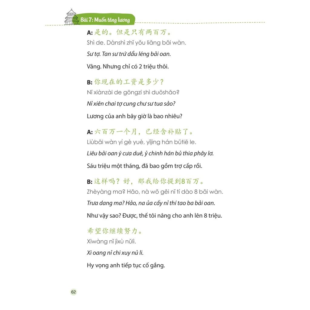 Ngoài việc cung cấp những mẫu câu giao tiếp hàng ngày (bao gồm phần chữ Hán, phiên âm chuẩn quốc tế, phần âm mô phỏng bằng tiếng Việt - âm bồi, phần dịch nghĩa), cuốn sách còn đưa ra rất nhiều công thức ngắn gọn với giải thích đơn giản, dễ hiểu, cùng hệ thống từ mới theo chuyên ngành giúp người học có thể vận dụng kiến thức một cách linh hoạt trong công việc và cuộc sống.
