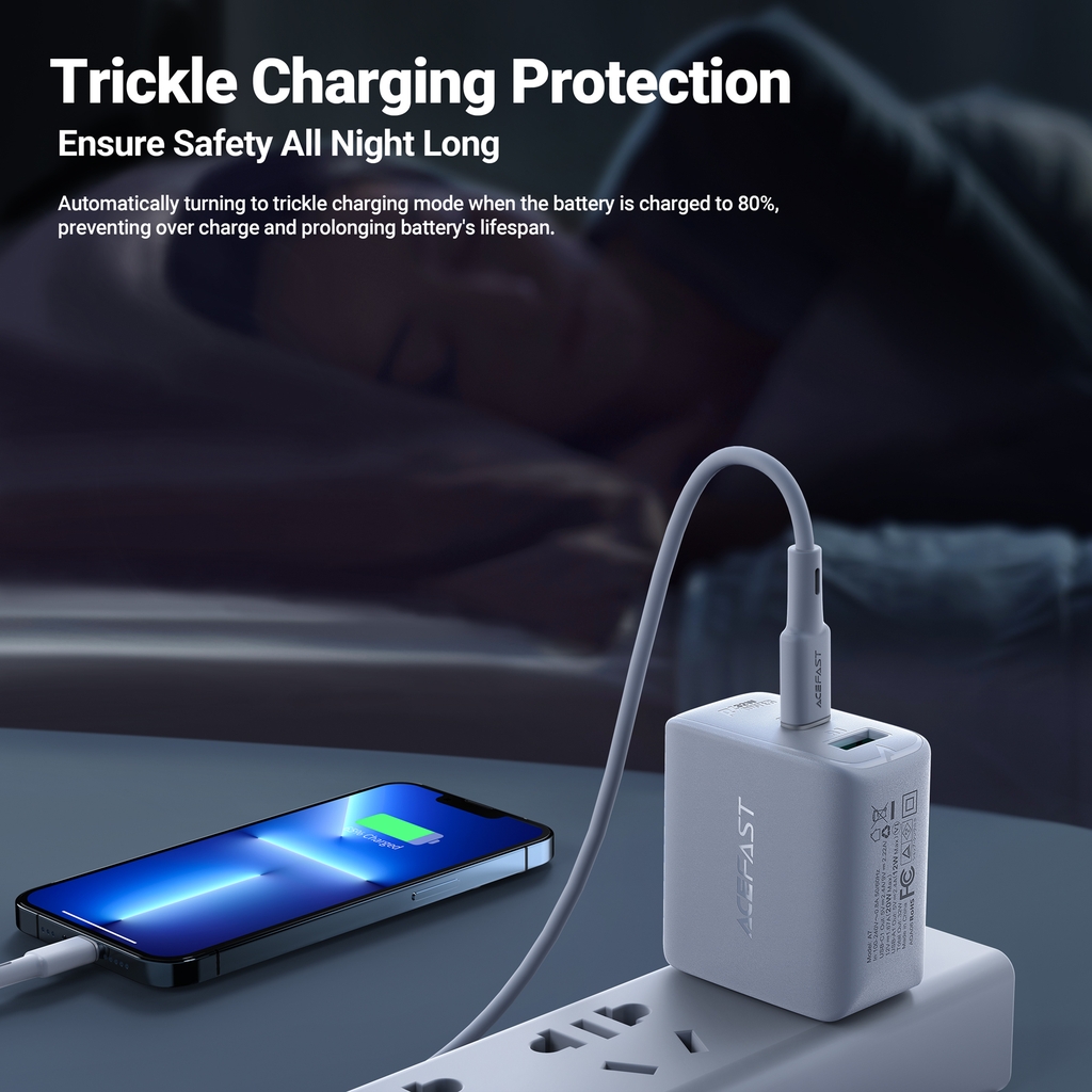 Sạc Acefast A7, 2 cổng USB-C PD3.0 20W và USB-A 12W, tổng công suất 32W phích cắm US, hỗ trợ hầu hết các giao thức sạc nhanh. Chất liệu PC chống cháy, chắc chắn và bền, nhiều mạch bảo vệ, hạn chế bám vân tay và trầy xước, Tương thích nhiều thiết bị Đảm bảo an toàn khi sạc qua đêm Tự động chuyển sang chế độ sạc thấp khi pin được sạc đến 80%, ngăn ngừa sạc quá mức và kéo dài tuổi thọ pin. Thông số kỹ thuật: