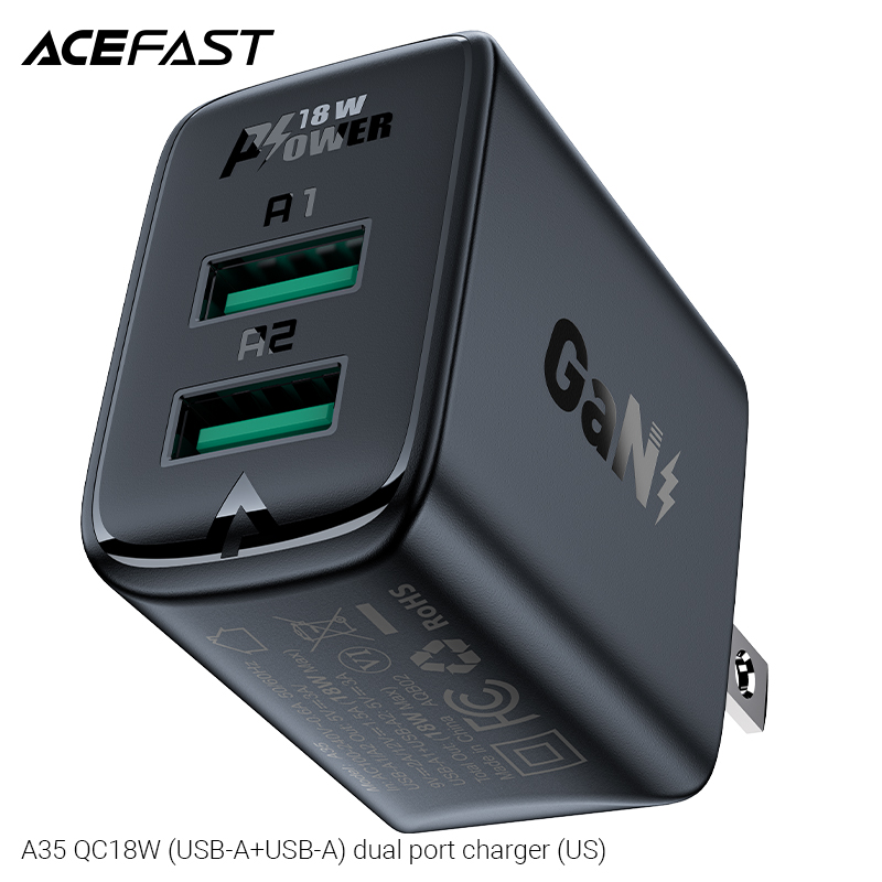 Sạc ACEFAST A35, 2 cổng USB-A QC18W, phích cắm US, hỗ trợ hầu hết các giao thức sạc nhanh. Thông số kỹ thuật: - Chất liệu: PC chống cháy. - Input: AC 100-240V, 0.6A, 50/60Hz, phích cắm US. - Output: Mỗi cổng ra: -