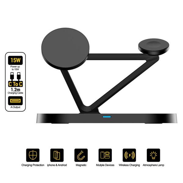 - Sạc không dây 3 trong 1: Hỗ trợ sạc không dây từ tính và đáp ứng yêu cầu sạc không dây của iPhone, tai nghe Apple, Apple Watch và các thiết bị khác.