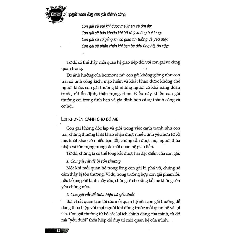 100 bí quyết nuôi dạy con gái thành công dựa vào đặc điểm giới tính và tâm lý của con gái để đề cập đến rất nhiều phương diện như cuộc sống, học tập, tính cách, tâm trạ của con gái