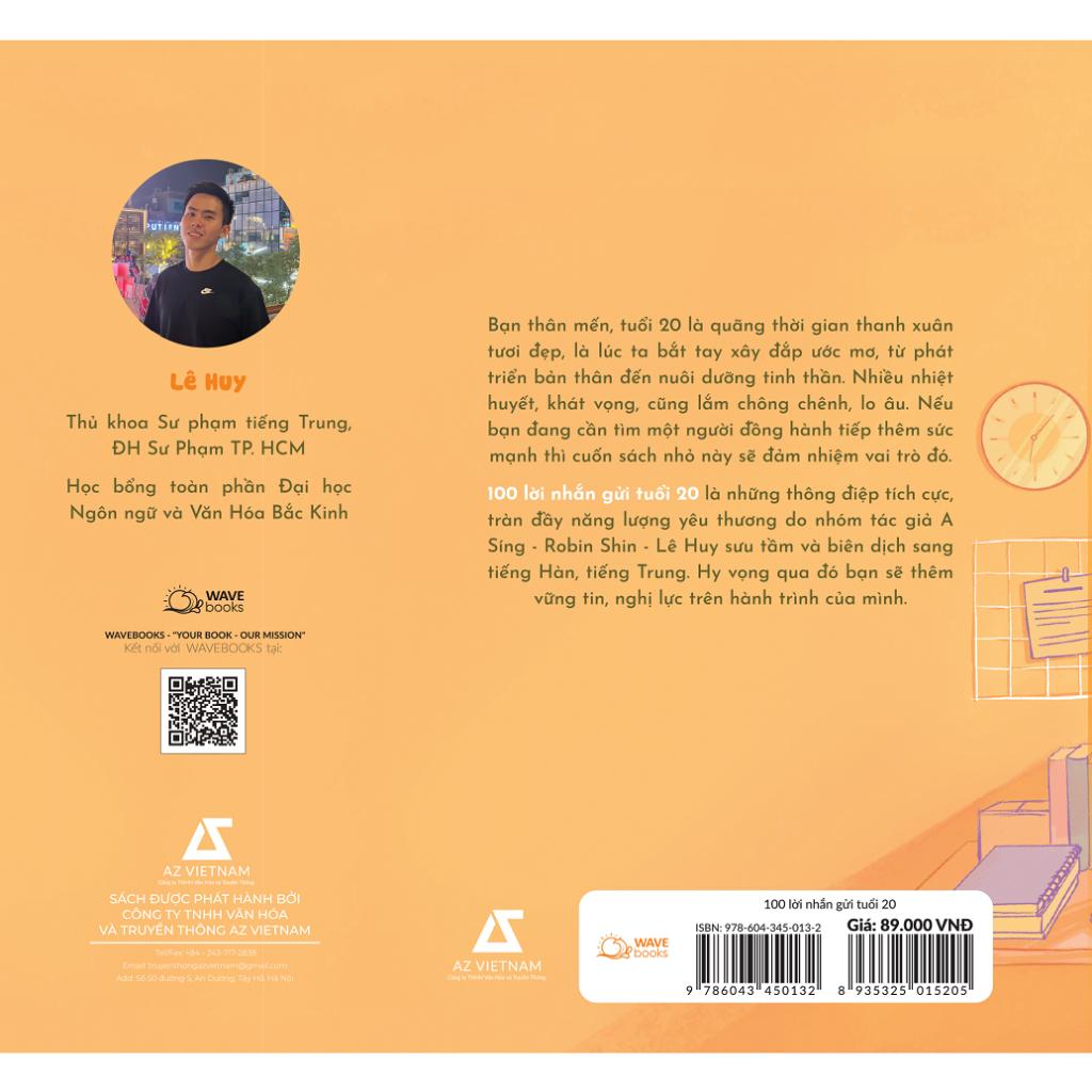 100 lời nhắn gửi tuổi 20 là cuốn sách tam ngữ Việt - Hàn - Trung, do ba tác giả trẻ tài năng A Síng, Robin Shin và Lê Huy sưu tầm, biên soạn dành tặng riêng cho các bạn ở độ tuổi đôi mươi.