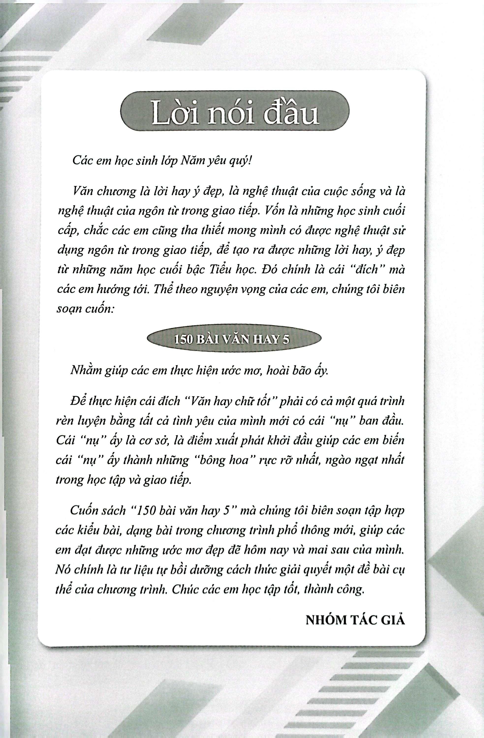 Văn chương là lời hay ý đẹp, là nghệ thuật của cuộc sống và là nghệ thuật của ngôn từ trong giao tiếp. Vốn là những học sinh cuối cấp, chắc các em cũng tha thiết mong m.ình có được nghệ thuật sử dụng ngôn từ trong giao tiếp, để tạo ra được những lời hay, ý đẹp từ những năm học cuối bậc Tiểu học. Đó chính là cái “đích” mà các em hướng tới. Thể theo nguyện vọng của các em, chúng tôi biên soạn cuốn: 150 BÀI VĂN HAY 5