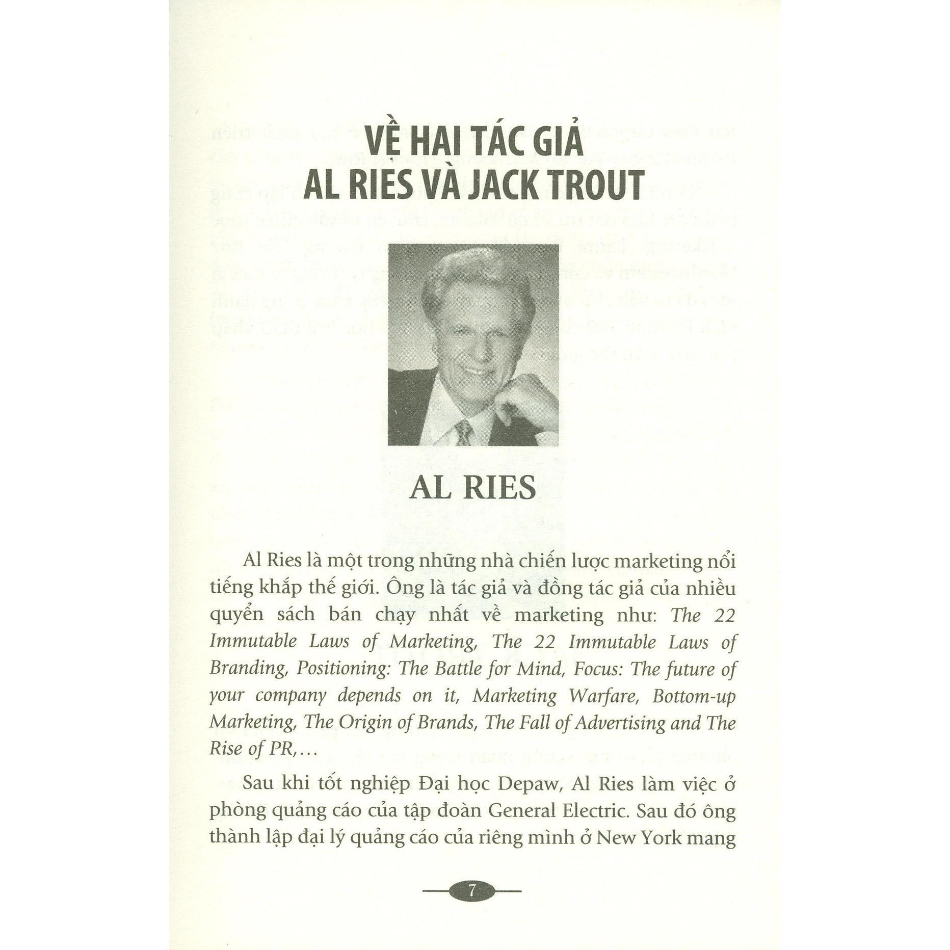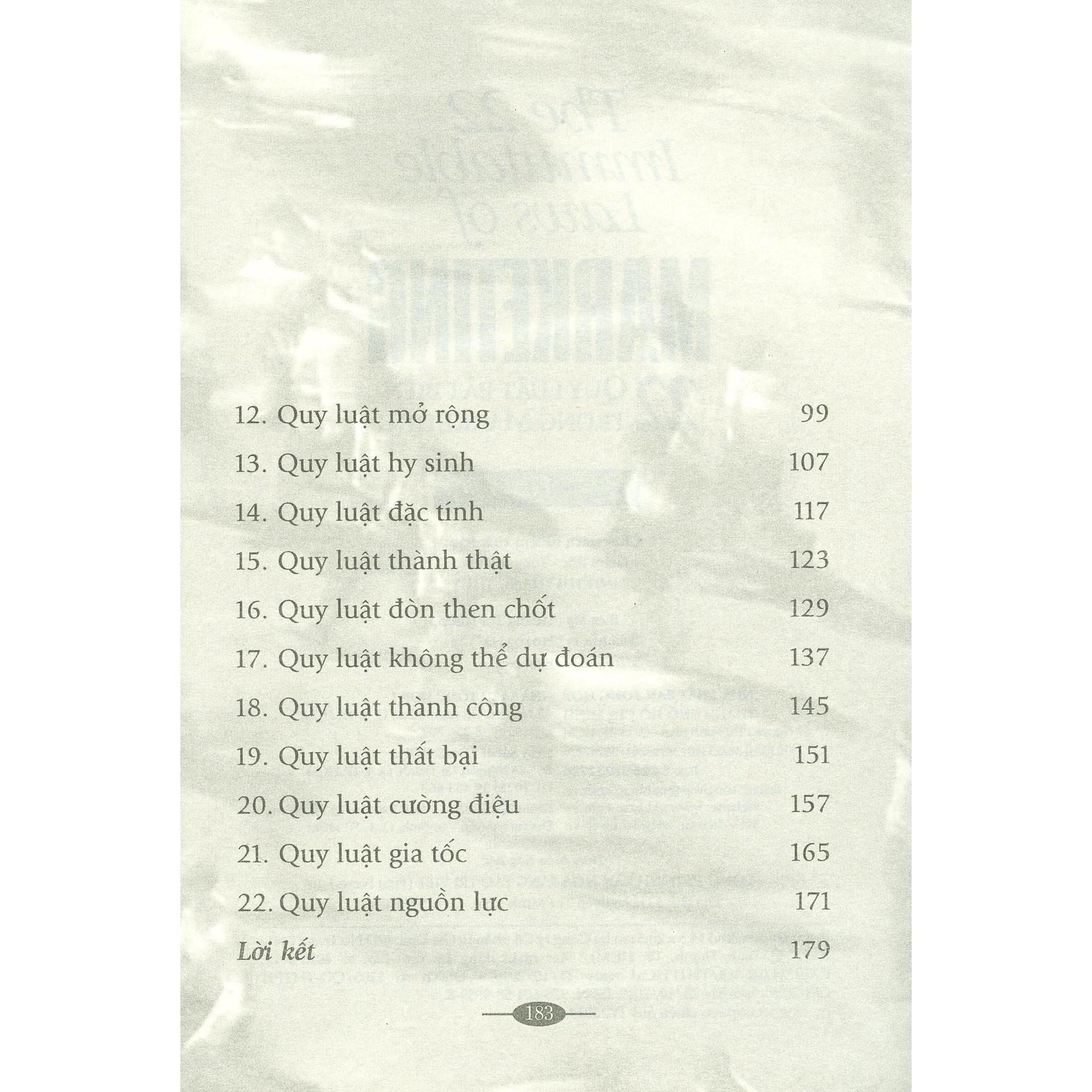Trong giai đoạn phát triển kinh tế và cạnh tranh hiện nay, sự thành công trong kinh doanh hay của một thương hiệu phụ thuộc rất nhiều vào cách thức tiến hành công tác marketing. Thế nhưng, hàng tỷ đô la đang bị tiêu phí vào những chương trình marketing kém hiệu quả, bất kể đó là chương trình được đầu tư nhiều công sức và tiền của. Thế nào là một chương trình marketing hiệu quả? Một chương trình marketing được xem là hoàn hảo khi nó được phát thảo kế hoạch đầy đủ, thực hiện đúng thời điểm, có nguồn hỗ trợ tài chính thuận lợi và phải tuân theo những quy luật marketing phù hợp. Ngược lại, một chiến dịch marketing hời hợt, không tuân theo quy luật sẽ mắc phải nhiều sai lầm và dĩ nhiên sẽ không đem lại kết quả như mong muốn. Vậy những quy luật trong marketing bao gồm những gì và có hiệu quả trong chiến lược kinh doanh như thế nào? Theo hai tác giả, đó là các quy luật:quy luật tiên phong, quy luật chủng loại, quy luật ghi nhớ, quy luật nhận thức, quy luật tập trung, quy luật độc quyền, quy luật nấc thang, quy luật song đôi, quy luật đối nghịch, quy luật mở rộng, quy luật hy sinh, quy luật thành công, quy luật gia tốc, quy luật nguồn lự