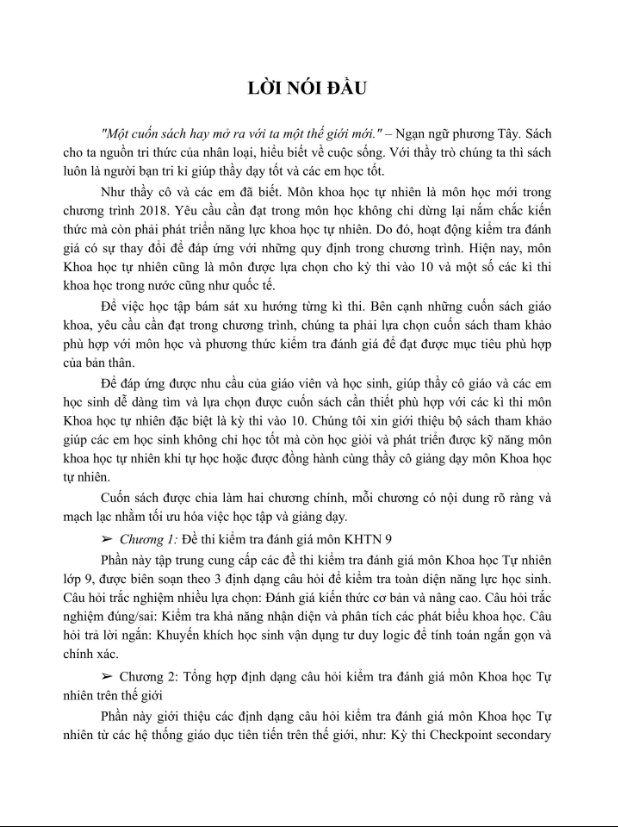 - Nội Dung : .Cuốn sách được chia làm hai chương chính, mỗi chương có nội dung rõ ràng và mạch lạc nhằm tối ưu hóa việc học tập và giảng dạy. ➢ Chương 1: Đề thi kiểm tra đánh giá môn KHTN 9 Phần này tập trung cung cấp các đề thi kiểm tra đánh giá môn Khoa học Tự nhiên lớp 9, được biên soạn theo 3 định dạng câu hỏi để kiểm tra toàn diện năng lực học sinh. Câu hỏi trắc nghiệm nhiều lựa chọn: Đánh giá kiến thức cơ bản và nâng cao. Câu hỏi trắc nghiệm đúng/sai: Kiểm tra khả năng nhận diện và phân tích các phát biểu khoa học. Câu hỏi trả lời ngắn: Khuyến khích học sinh vận dụng tư duy logic để tính toán ngắn gọn và chính xác. ➢ Chương 2: Tổng hợp định dạng câu hỏi kiểm tra đánh giá môn Khoa học Tự nhiên trên thế giới Phần này giới thiệu các định dạng câu hỏi kiểm tra đánh giá môn Khoa học Tự nhiên từ các hệ thống giáo dục tiên tiến trên thế giới, như: Kỳ thi Checkpoint secondaryschool của Cambridge. Bài thi của chương trình quốc tế IGCSE. Các kỳ thi học sinh giỏi quốc tế về khoa học. Giúp người đọc hiểu rõ hơn về cách kiểm tra tư duy khoa học trên thế giới. Định hướng cho giáo viên trong việc xây dựng các bài kiểm tra phù hợp với năng lực học sinh. Giúp học sinh làm quen với các dạng câu hỏi hiện đại, chuẩn bị tốt hơn cho các kỳ thi quốc tế hoặc kiểm tra có tính ứng dụng cao. Tác giả: Hà Thị Thúy - Nguyễn Thị Hằng Nga (Đồng chủ biên) Nhà xuất bản: Dân Trí Năm xuất bản: 2024 Số trang: 276 Khổ sách: 19 x 27 cm