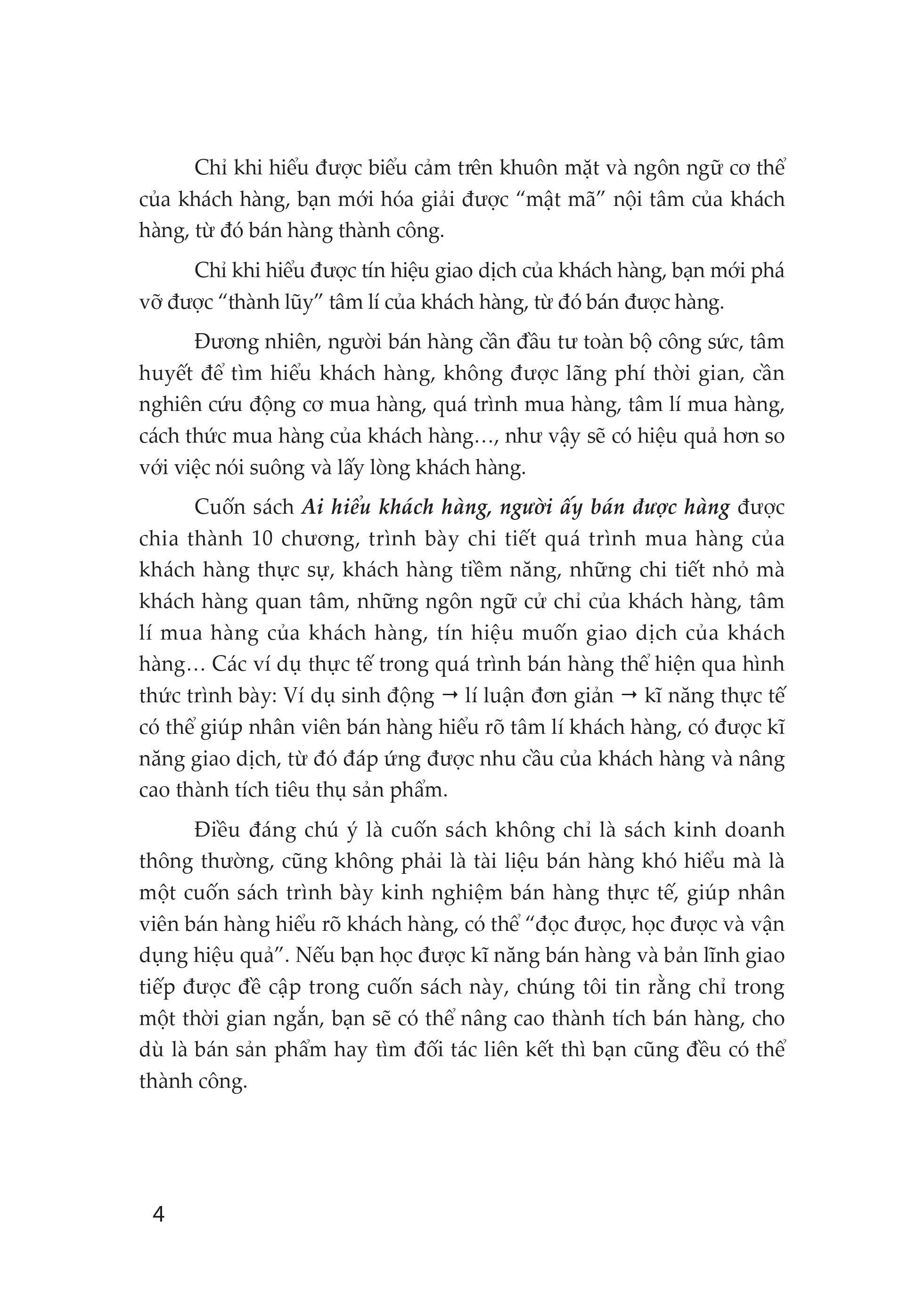Cuốn sách Ai hiểu khách hàng, người ấy bán được hàng giới thiệu quá trình nhân viên bán hàng tìm kiếm khách hàng tiềm năng, quá trình chi tiêu của khách hàng, những chi tiết nhỏ mà khách hàng quan tâm, lời nói và hành động, cử chỉ của khách hàng, tâm lí của khách hàng, tín hiệu giao dịch của khách hàng… giúp người bán hàng hiểu được khách hàng, kịp thời đáp ứng nhu cầu của họ, từ đó dễ dàng có được đơn đặt hàng và nâng cao thành tích tiêu thụ sản phẩm.