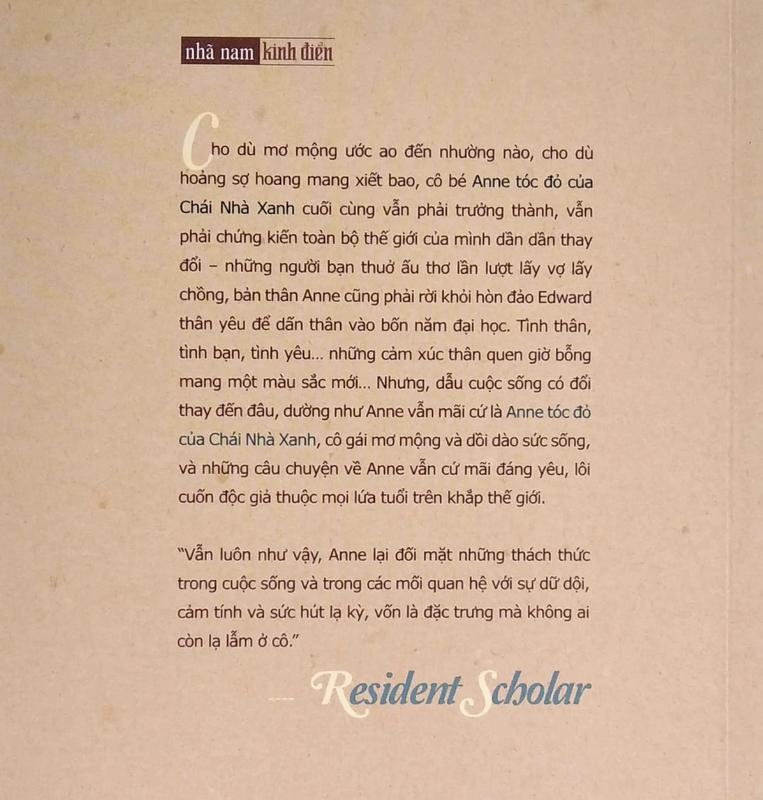 Tình thân, tình bạn, tình yêu… những cảm xúc thân quen giờ bỗng mang một màu sắc mới… Nhưng, cho dù cuộc sống có đổi thay đến đâu, dường như Anne vẫn mãi cứ là Anne tóc đỏ của Chái Nhà Xanh, cô gái mơ mộng và dồi dào sức sống, và những câu chuyện về Anne vẫn cứ mãi đáng yêu, lôi cuốn độc giả thuộc mọi lứa tuổi trên khắp thế giới.