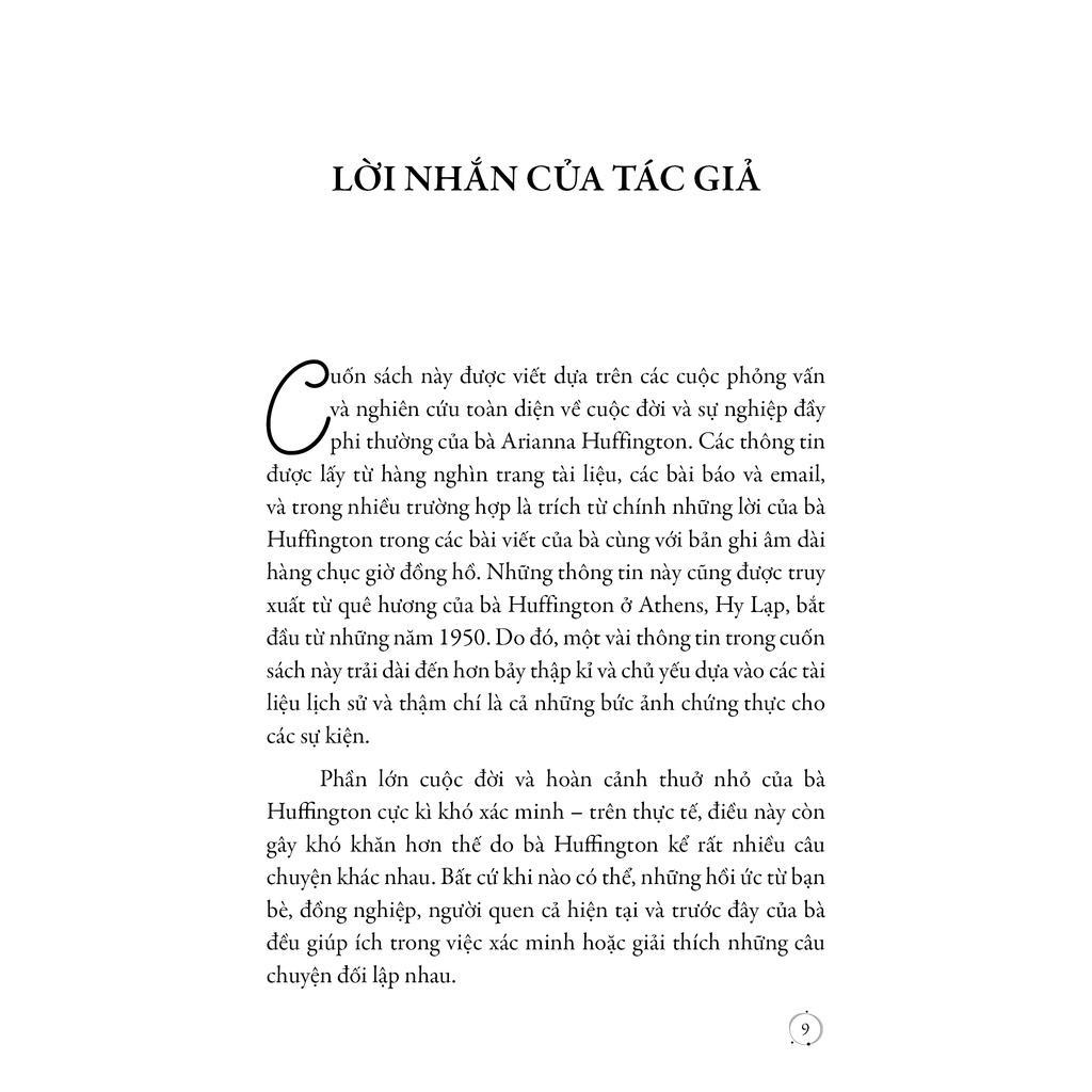 Tuy là một phụ nữ có tầm ảnh hưởng cũng như có một cuộc đời hết sức thành công và phong phú, nhưng bà lại không viết tự truyện, cũng không để các tác giả khác chắp bút viết tự truyện về cuộc đời mình. Bởi thế, cuốn sách này không hẳn là cuốn tự truyện, mà phần nhiều là những quan điểm của tác giả về Ariana Huffington và những thành công hoặc thất bại trên chặng đường dài mà bà đi qua. Leah McGrath Goodman tiến hành tìm hiểu và tìm kiếm các thông tin về Huffington để làm tư liệu viết sách. Có thể thấy rằng tác giả đã nghiên cứu rất kĩ lưỡng về Ariana Huffington nên cô có cái nhìn tổng quát, nhận xét xác đáng và cảm nhận hết sức sâu sắc, tinh tế về bà. Và bởi vậy đây là một cuốn sách đầy cảm hứng, có cả chiều rộng và chiều sâu.