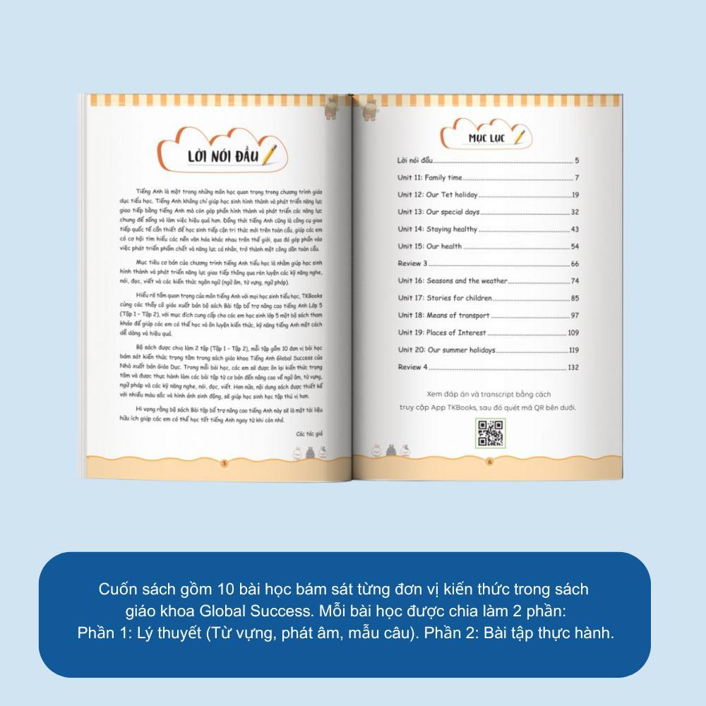 Bài tập bổ trợ nâng cao Tiếng Anh lớp 5 – Tập 2 được biên soạn với mục tiêu đồng hành cùng các em học sinh lớp 5 trong việc ôn luyện và củng cố toàn bộ kiến thức tiếng Anh của học kì 2. Nội dung sách bám sát chương trình 10 đơn vị bài học, từ Unit 11 đến Unit 20, trong sách giáo khoa Tiếng Anh 5 Global Success của Nhà xuất bản Giáo dục Việt Nam.