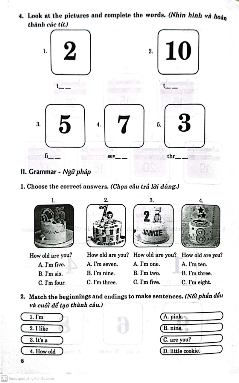 Với các phần Từ vựng và Ngũ pháp, các em sẽ được ôn lại các từ vựng và mâu cầu đã học trong bài, sau đó ứng dụng các từ vựng và mẫu câu đó