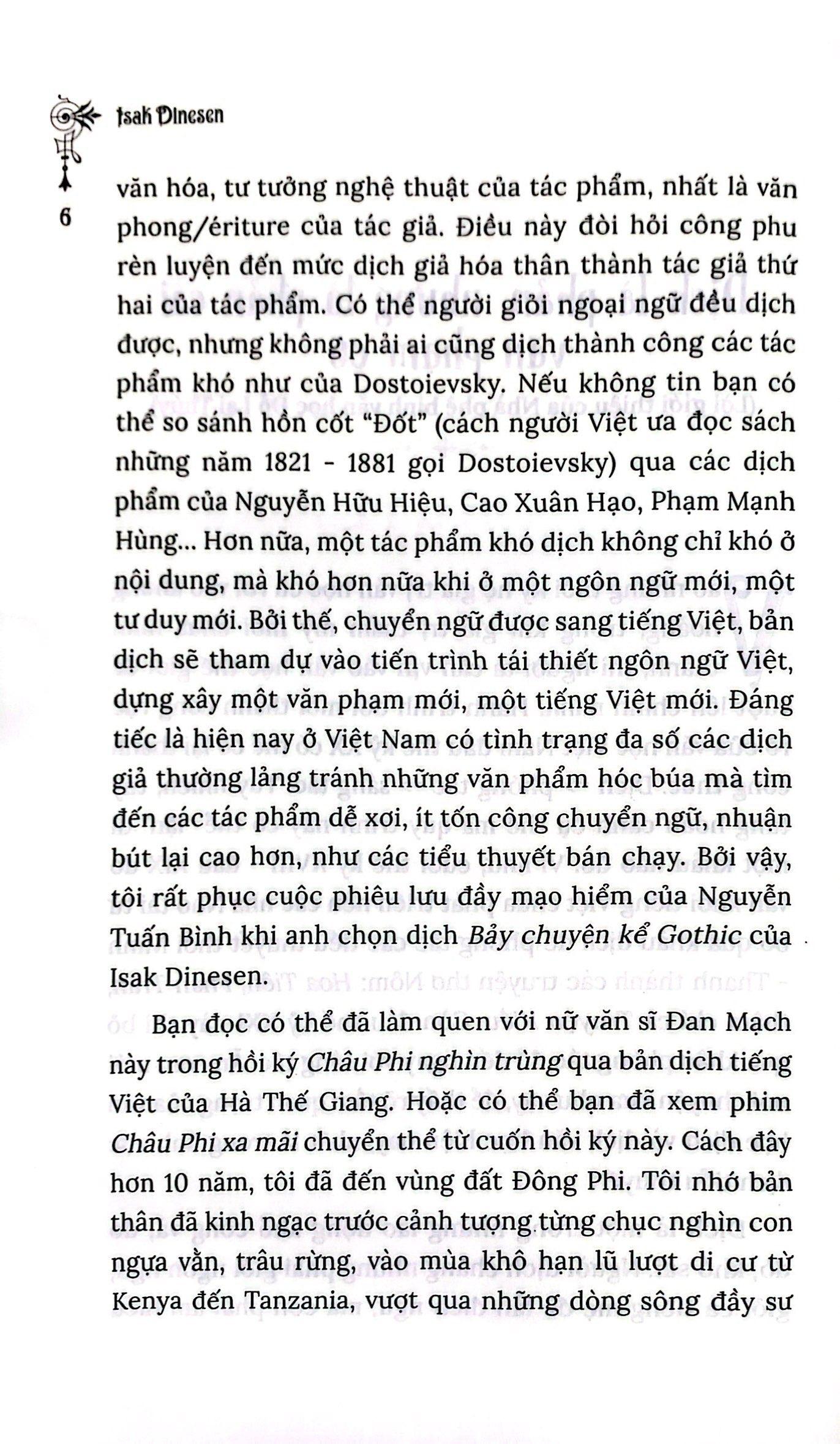 Khi nhắc tới nhà văn Đan Mạch Isak Dinesen, chắc hẳn bạn đọc Việt Nam sẽ nghĩ ngay tới “Châu Phi nghìn trùng” nổi tiếng – cuốn hồi ký của bà về 17 năm sống ở châu Phi – qua bản dịch ngọt ngào của dịch giả Hà Thế Giang. Nhưng có lẽ ít bạn đọc biết rằng chính tác phẩm đầu tay “Bảy chuyện kể Gothic” xuất bản năm 1934 ở Mỹ đã đưa Isak Dinesen trở thành một trong những nhà văn quan trọng nhất thế kỷ XX.