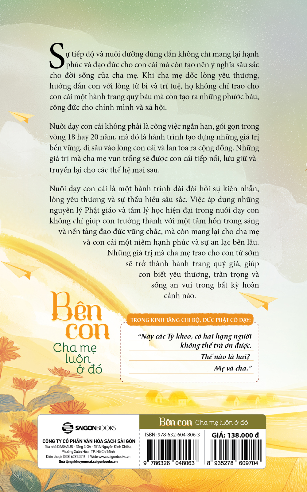 "Bên con, cha mẹ luôn ở đó" không phải là một cuốn sách hướng dẫn cách nuôi dạy con. Nó cũng không phải một bài thuyết pháp cao siêu về Phật học. Cuốn sách này là một chiếc gương để những người làm cha mẹ nhìn lại chính mình. Là một dòng suối để người đọc rửa bớt những khô cằn, mỏi mệt. Và là một tiếng chuông nhẹ để đánh thức sự tỉnh thức trong hành trình yêu thương người thân của mình.