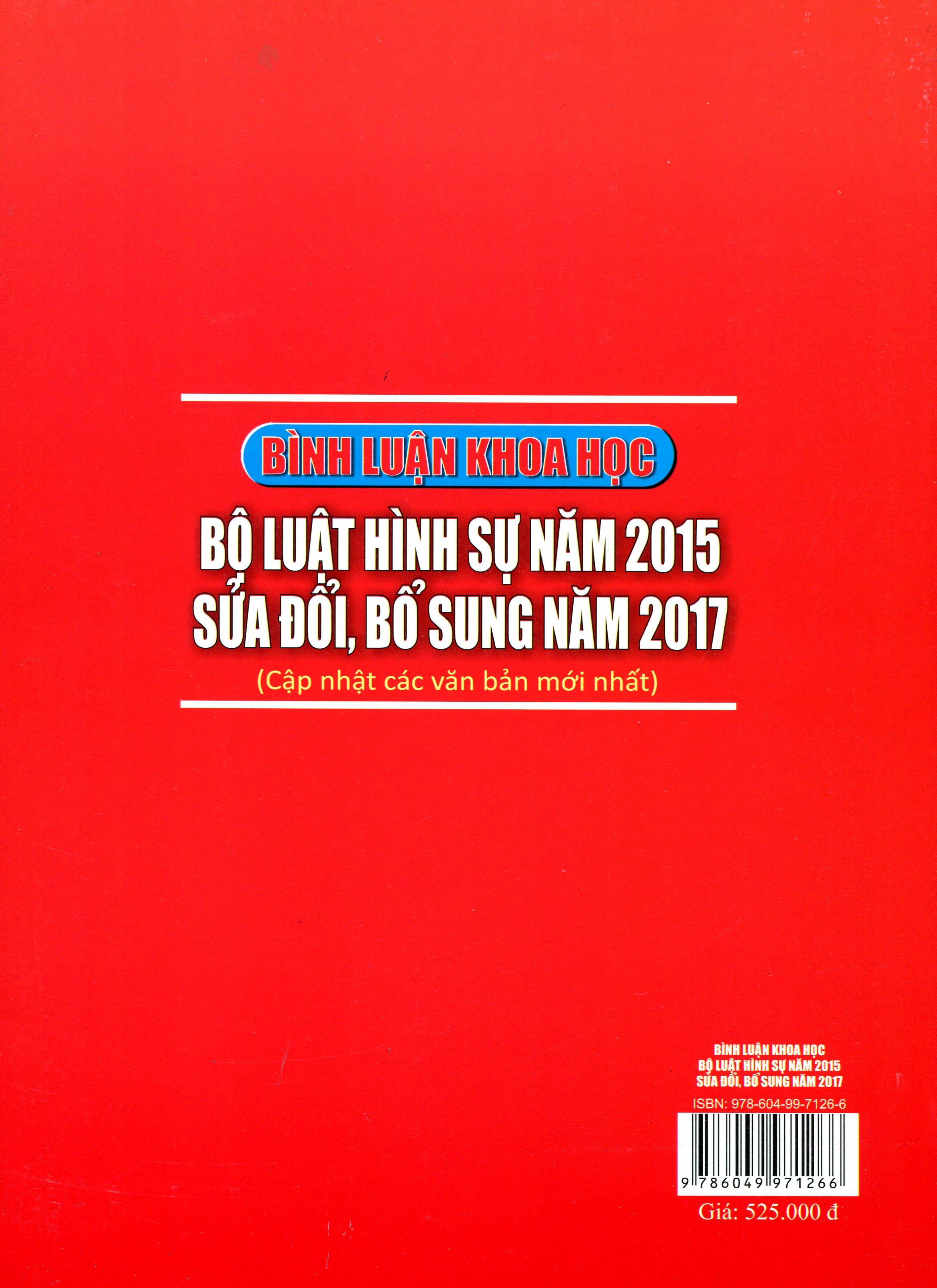 Để Bộ luật Hình sự năm 2015 đi vào cuộc sống, góp phần nâng cao ý thức pháp luật của người dân, tạo điều kiện cho việc nhận thức thống nhất trong áp dụng để giải quyết vụ án hình sự, cần thiết phải có nhận thức đầy đủ, sâu sắc, đúng đắn nội dung và tinh thần của nó. Đáp ứng yêu cầu đó, Nhà xuất bản Lao Động xuất bản cuốn “Bình luận khoa học Bộ luật Hình sự năm 2015 sửa đổi, bổ sung năm 2017”. Cập nhật các văn bản mới nhât .Với cơ sở lý luận khoa học, nội dung phong phú và sâu sắc, hy vọng công trình này có giá trị tham khảo đối với những người làm công tác thực tiễn trong các cơ quan bảo vệ pháp luật, là tài liệu tham khảo cho các sinh viên chuyên ngành Luật của các cơ sở đào tạo, những người giảng dạy và nghiên cứu luật Hình sự cũng như tất cả những ai quan tâm đến pháp luật nói chung và pháp luật hình sự nói riêng.