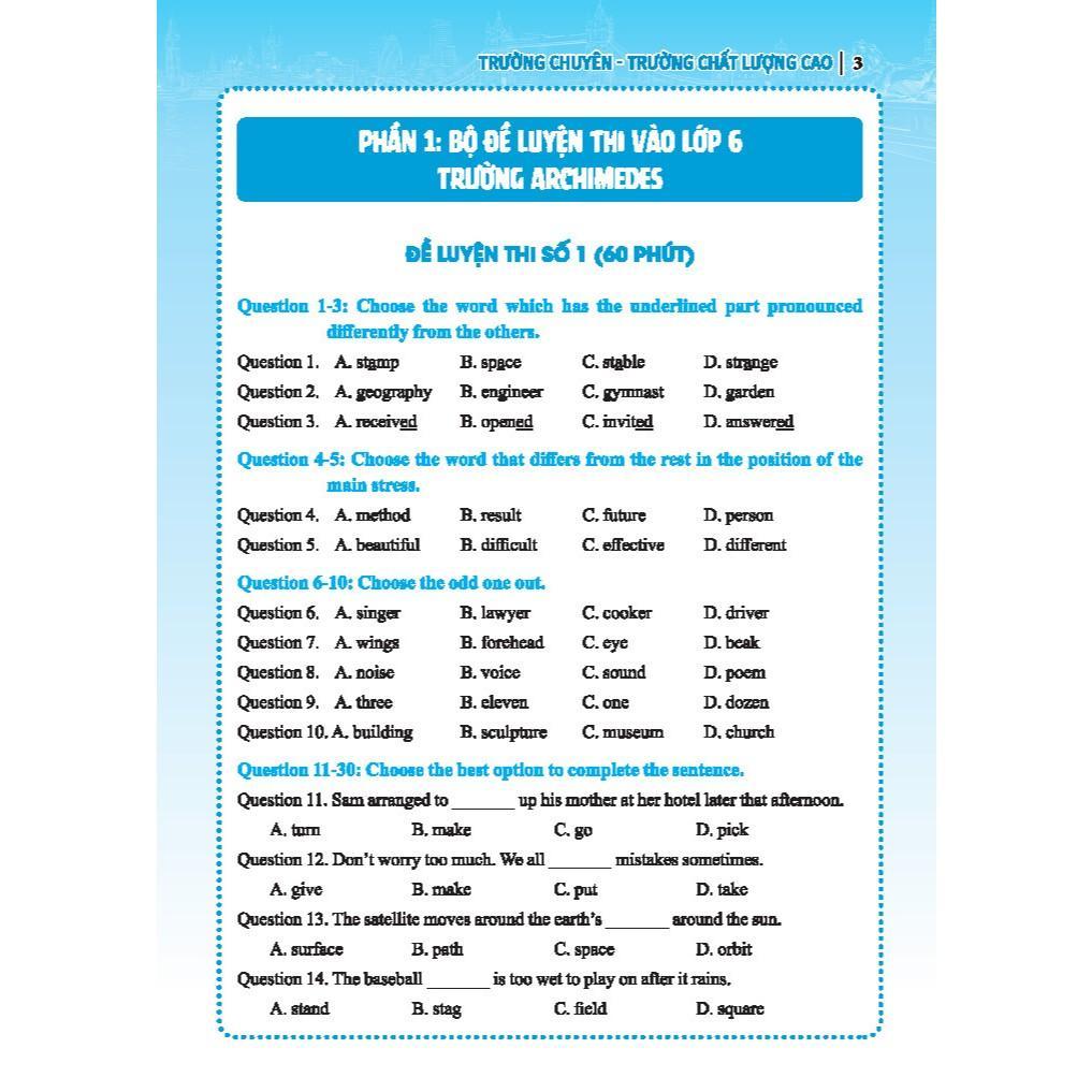 Cuốn “Bộ đề luyện thi môn Tiếng anh vào lớp 6 trường chuyên , chất lượng cao” lần này sẽ là cẩm nang giúp các em rút ngắn khoảng cách và những hạn chế trong hiểu biết của mình để đến với những đề thi vào lớp 6, thi vào các trường huyên, lớp Chọn sát với đề thi chính thức.