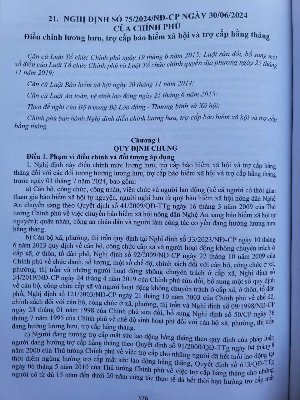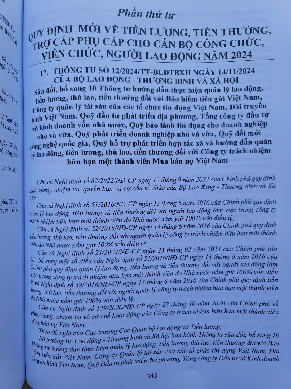 Thời gian gần đây, Chính phủ và các Bộ ngành đã ban hành nhiều văn bản pháp quy liên quan đến lĩnh vực lao động, trợ cấp, tiền lương như: Nghị định 73/2024/NĐ-CP ngày 30/06/2024 Quy định mức lương cơ sở và chế độ tiền thưởng đối với cán bộ, công chức, viên chức và lực lượng vũ trang, Nghị định 74/2024/NĐ-CP ngày 30/06/2024 Quy định mức lương tối thiểu đối với người lao động làm việc theo hợp đồng lao động, Nghị định 75/2024/NĐ-CP ngày 30/06/2024 Điều chỉnh lương hưu, trợ cấp bảo hiểm xã hội và trợ cấp hằng tháng…