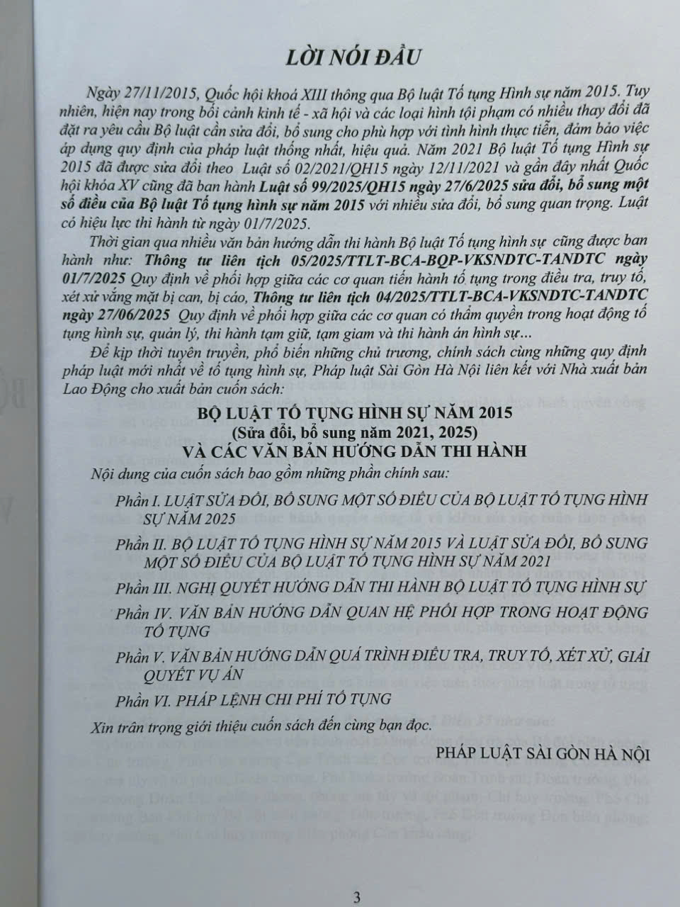 Nhằm phổ biến đến Quý Cơ quan, Đơn vị và Quý khách hàng thân thiết nắm bắt kịp thời những quy định pháp luật mới nêu trên. Nhà sách Nam Việt xin trân trọng giới thiệu cuốn sách: Bộ Luật Tố Tụng Hình Sự năm 2015 sửa đổi, bổ sung năm 2021, 2025 và Các Văn Bản Hướng Dẫn Thi Hành