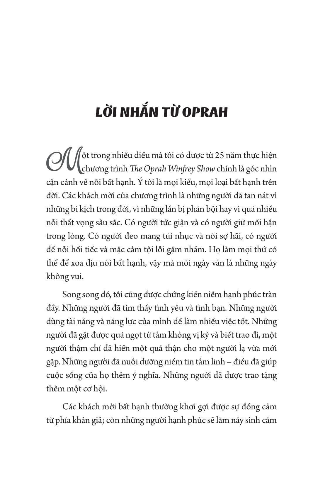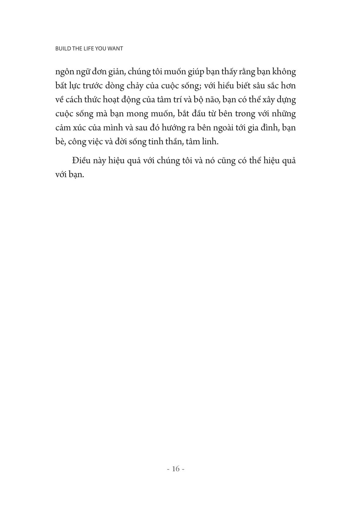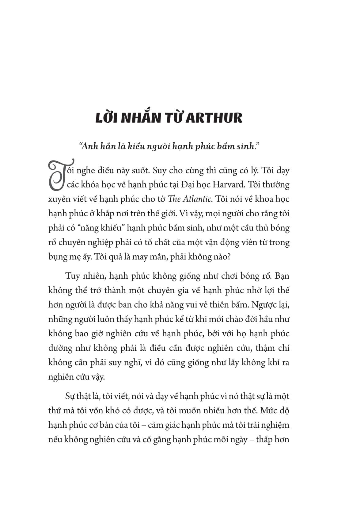Tuy nhiên, sẽ không giống những cuốn sách khác bạn đã đọc, cuốn sách này không hối thúc bạn tự lực vươn lên. Đây không phải là cuốn sách về sức mạnh và ý chí, mà là về kiến thức và cách sử dụng. Nó cũng giống như, nếu bạn không biết chiếc xe của m.ình đang bất ổn ở đâu, ý chí quyết tâm cực độ sẽ không giúp bạn giải quyết vấn đề. bản hướng dẫn sử dụng của nhà sản xuất mới là thứ hữu ích hơn nhiều. Tương tự, khi có điều gì đó không ổn với niềm hạnh phúc của bạn, trước hết bạn cần những thông tin rõ ràng và khoa học về cách thức hoạt động của hạnh phúc, sau đó là tham khảo cách áp dụng các thông tin này vào cuộc sống của m.ình. Đó chính là nội dung của cuốn sách bạn đang cầm trên tay.