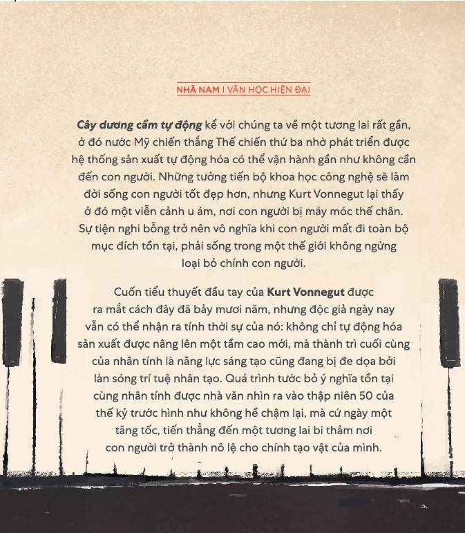 Cây dương cầm tự động kể với chúng ta về một tương lai rất gần, ở đó nước Mỹ chiến thắng Thế chiến thứ ba nhờ phát triển được hệ thống sản xuất tự động hóa có thể vận hành gần như không cần đến con người. Những tưởng tiến bộ khoa học công nghệ sẽ làm đời sống con người tốt đẹp hơn, nhưng Kurt Vonnegut lại thấy ở đó một viễn cảnh u ám, nơi con người bị máy móc thế chân. Sự tiện nghi bỗng trở nên vô nghĩa khi con người mất đi toàn bộ mục đích tồn tại, phải sống trong một thế giới không ngừng loại bỏ chính con người.