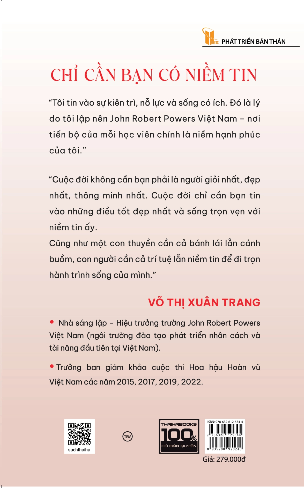 Tên sách          Chỉ cần bạn có niềm tin  Tác giả Võ Thị Xuân Trang  Số trang           408 trang  Trọng lượng    450 grams  Nhà xuất bản   Công Thương  Khổ     15.5 x 24 cm  Barcode - ISBN          8935280920248 – 9786326125344   CHỈ CẦN BẠN CÓ NIỀM TIN Võ Thị Xuân Trang  “Chỉ cần bạn có niềm tin” là cuốn tự truyện của tác giả Võ Thị Xuân Trang, kể về hành trình đầy cảm hứng từ một cô gái miền Tây đến nữ doanh nhân thành đạt, người sáng lập và điều hành trường John Robert Powers Việt Nam. Cuốn sách mở đầu bằng những ký ức về tuổi thơ của tác giả, một người sinh ra trong những năm cuối của chiến tranh và lớn lên khi đất nước vừa hòa bình. Giữa cuộc sống còn nhiều thiếu thốn, ước mơ ban đầu của bà rất đỗi giản dị: trở thành một người vợ, người mẹ, làm hậu phương vững chắc cho gia đình. Tuy nhiên, bước ngoặt cuộc đời đã đến khi bà chuyển đến Thành phố Hồ Chí Minh, nơi nhịp sống sôi động đã đánh thức những khát khao tiềm ẩn. Giữa guồng quay mưu sinh, bà bắt đầu hành trình tìm về bản thể với câu hỏi day dứt: “Mình là ai? Mình thật sự muốn gì?” Sứ mệnh nâng tầm người Việt Định mệnh đã đưa bà đến với triết lý của John Robert Powers, một tinh thần vượt thời gian về việc đào tạo nhân cách và sự tự tin. Nhận thấy người Việt Nam còn mang nhiều mặc cảm vô hình khi bước ra thế giới, bà quyết tâm mang John Robert Powers về quê hương. Ước mơ của bà là một ngày nào đó, người Việt có thể đứng ngang hàng với bạn bè quốc tế một cách đàng hoàng, tự tin và đầy nhân cách. Hành trình 20 năm của John Robert Powers Việt Nam đã giúp hàng chục ngàn học viên đánh thức phiên bản tốt đẹp nhất của chính mình. Thông điệp cốt lõi Cuốn sách không chỉ kể về cuộc đời tác giả mà còn là một lời nhắn gửi mạnh mẽ đến người đọc. Đó là câu chuyện về sự chuyển hóa kỳ diệu, khẳng định rằng bất kỳ ai cũng có thể vươn lên và thay đổi, miễn là họ giữ vững một điều quan trọng nhất: Chỉ cần bạn có niềm tin