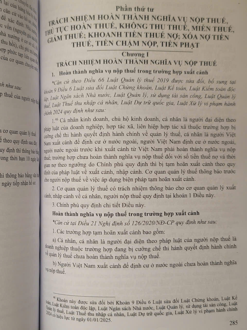 Phần thứ tư. TRÁCH NHIỆM HOÀN THÀNH NGHĨA VỤ NỘP THUẾ, THỦ TỤC HOÀN THUẾ, KHÔNG THU THUẾ, MIỄN THUẾ, GIẢM THUẾ; KHOANH TIỀN THUẾ NỢ: XÓA NỢ TIỀN THUẾ, TIỀN CHẬM NỘP, TIỀN PHẠT.