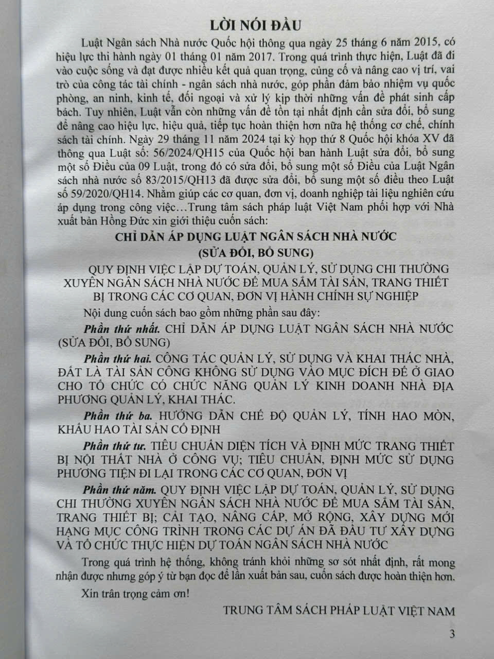 Nhằm phổ biến đến Quý Cơ quan, Đơn vị và Quý khách hàng thân thiết nắm bắt kịp thời những quy định mới nêu trên. Nhà sách Nam Việt xin trân trọng giới thiệu cuốn sách: Chỉ Dẫn Áp Dụng Luật Ngân Sách Nhà Nước (sửa đổi, bổ sung), Quy Định Về Việc Lập Dự Toán, Quản Lý, Sử Dụng, Chi Thường Xuyên Ngân Sách Nhà Nước Để Mua Sắm Tài Sản, Trang Thiết Bị Trong Các Cơ Quan Đơn Vị Hành Chính Sự Nghiệp