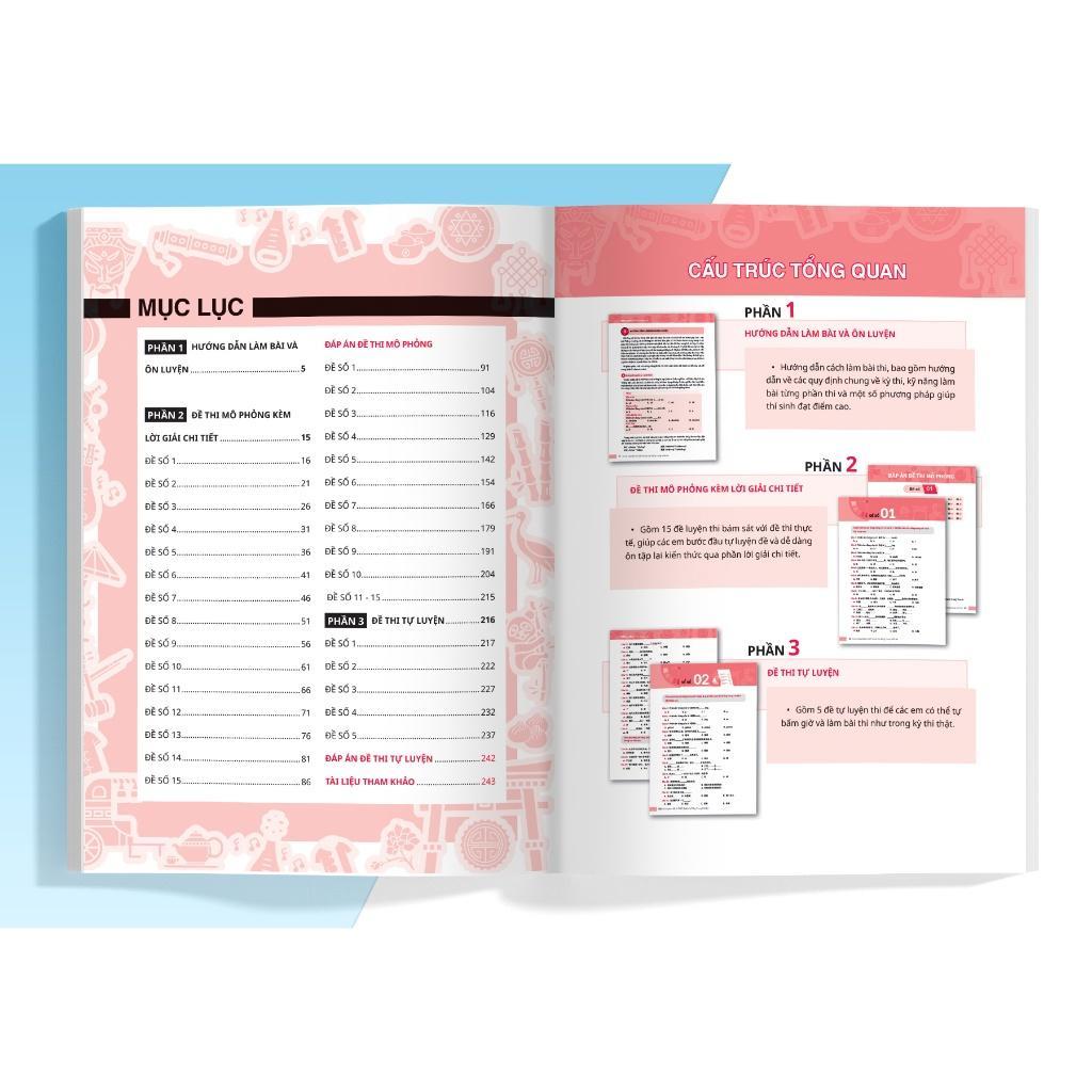 Để giúp bạn làm quen với đề thi thực tế và nâng cao kỹ năng làm bài, sách cung cấp 15 đề thi thực hành chất lượng cao. Bên cạnh đó, sách còn bao gồm 5 đề tự luyện kèm lời giải chi tiết, giúp bạn tự đánh giá, phân tích và cải thiện kết quả học tập của mình.