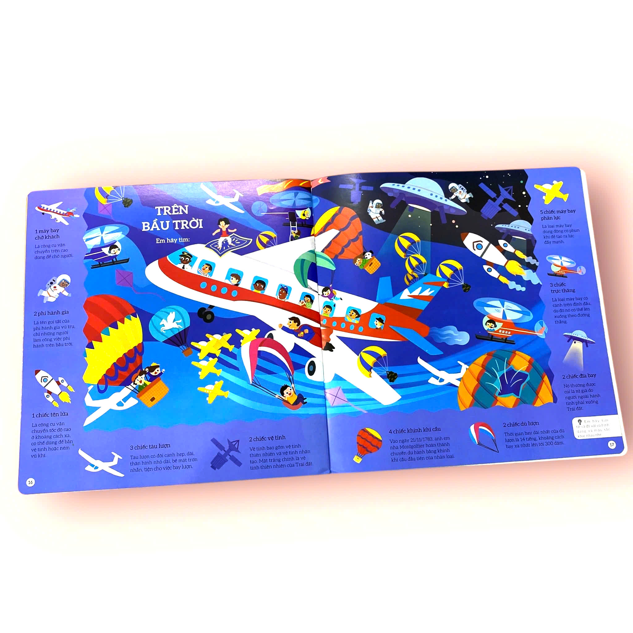 Trong cuốn chủ đề "Phương tiện giao thông" bé sẽ được học và tìm kiếm các phương tiện trong công viên, bên bờ biển, trên đường, khi có cháy, trong công trường xây dựng, công trường sửa đường, bên bờ hồ, ở thôn quê, khu trượt tuyết.