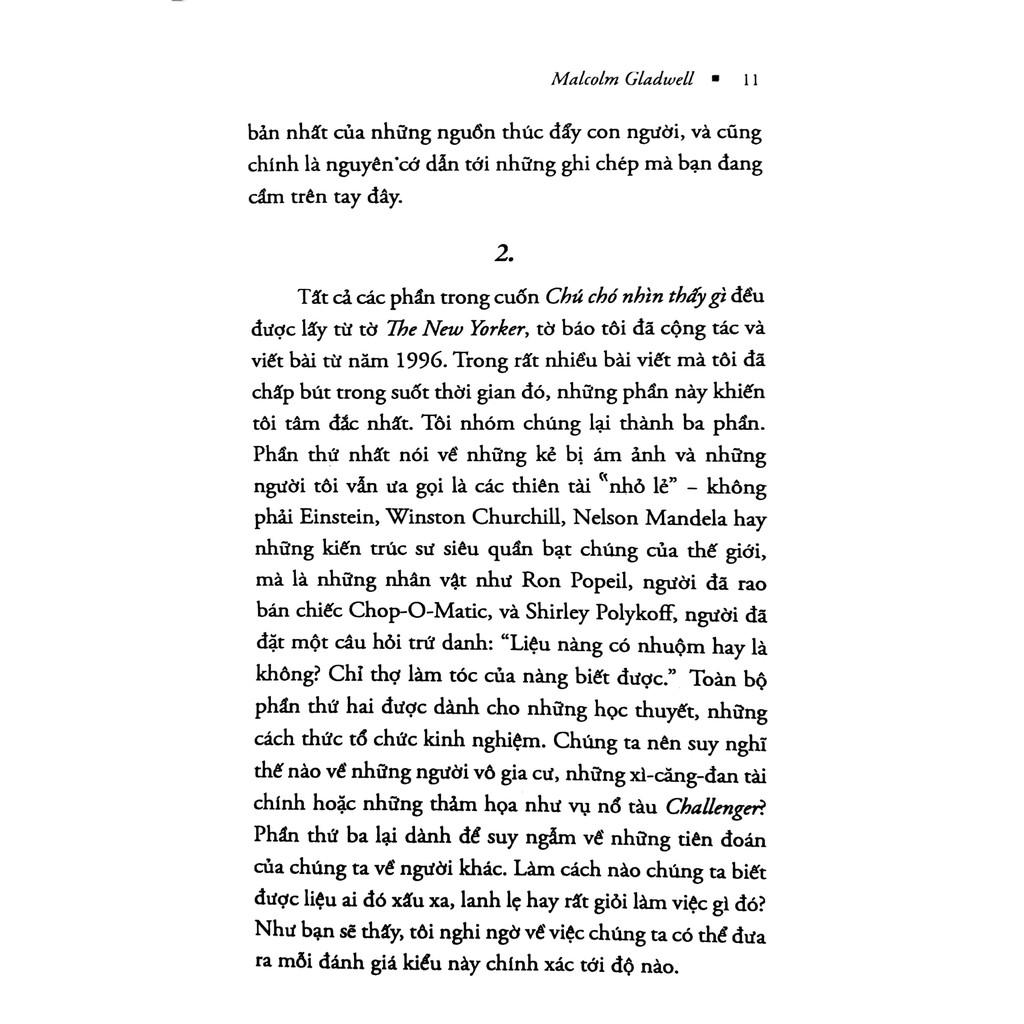 GIỚI THIỆU SÁCH : Chú Chó Nhìn Thấy Gì? (Tái Bản ) Có cấu trúc và giọng văn cân nhắc chỉn chu, song bạn sẽ thấy 19 bài viết trong cuốn sách này đề cập đến những khía cạnh hoàn toàn khác nhau của cuộc sống từ việc: "Mù tạt giờ đây xuất hiện với cả tá chủng loại. Vì đây ketchup vẫn nguyên xi y dạng?" "Những điều về sức khỏe phụ nữ mà cha đẻ của thuốc ngừa thai không hề biết" "Cuộc sống của một người có đáng bị hủy hoại chỉ vì lời buộc tội đạo văn?"... Mỗi bài viết điều có khả năng thu hút bạn, khiến bạn phải ngẫm nghĩ, hay đem lại cho bạn ý niệm lờ mờ nào đó về trí não của kẻ khác". Hãy đọc và cùng khám phá những cuộc phiêu lưu của Gladwell để hiểu rõ hơn những hiện tượng xung quanh bạn, qua đó bồi đắp thêm kinh nghiệm sống cho bản thân. Cuốn sách chia làm ba phần: Phần thứ nhất: Những kẻ ám ảnh, những người tiên phong và những kiểu thiên tài nhỏ lẻ khác Phần thứ hai: Những luận thuyết, tiên lường và chuẩn đoán Phần thứ ba: Nhân phẩm, tính cách và trí tuệ