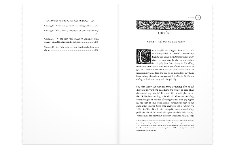 A – ĐỀ TÀI VÀ CỨ LIỆU CỦA THẢO LUẬN Chương 4 – Bốn nhóm Đề tài (Vấn đề) và cứ liệu (Mệnh đề) Chương 5 – Bốn loại Diễn tả Chương 6 – Xử lý riêng rẽ tới mức nào các loại diễn tả Chương 7 – Các loại Giống nhau Chương 8 – Hai phân nhóm bằng chứng của Diễn tả Chương 9 – Mười Phạm trù và tương quan của chúng đối với Diễn tả Chương 10 – Mệnh đề biện chứng Chương 11 – Vấn đề biện chứng Chương 12 – Suy luận biện chứng
