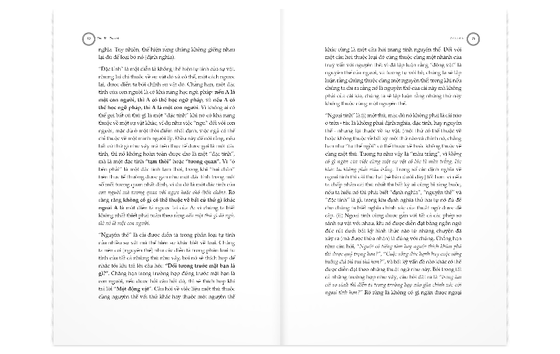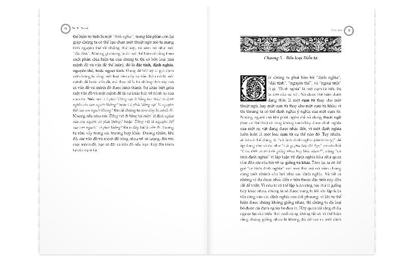 (d) VỀ ĐỊNH NGHĨA (Quyển VI) QUYỂN VI Chương 1 – Phân loại tổng quát các vấn đề liên quan tới định nghĩa. Khác biệt của các vấn đề được xem xét và các vấn đề chưa được xem xét. Quy tắc kiểm tra liệu định nghĩa có được đưa ra đúng hay không – Sự tối nghĩa và không liên quan cần phải tránh Chương 2 – Sự tối nghĩa, cách tránh Chương 3 – Không liên quan, cách tránh Chương 4 – Quy tắc đảm bảo các thuật ngữ định nghĩa cần phải đứng trước và có tính hình dùng hơn; cách phát hiện ra thất bại ở khía cạnh sau; ở khía cạnh trước Chương 5 – Quy tắc đối với nguyên thể Chương 6 – Quy tắc đối với đặc trưng Chương 7 – Quy tắc khác nhau, bao gồm quy tắc để kiểm tra định nghĩa của thuật ngữ có chấp nhận các mức độ khác nhau hay không Chương 8 – Quy tắc kiểm tra định nghĩa của một thuật ngữ tương quan Chương 9 – Quy tắc kiểm tra định nghĩa của một trạng thái; một thuật ngữ tương quan; các đối lập; sự khuyết thiếu; của cái bị nhầm lẫn với “một” Chương 10 – Quy tắc được rút ra từ biến đổi loại từ; từ tham chiếu của định nghĩa đến “ý niệm” của thuật ngữ được định nghĩa Chương 11 – Quy tắc kiểm tra định nghĩa của một thuật ngữ phức hợp Chương 12 – Quy tắc khác nhau, bao gồm quy tắc kiểm tra định nghĩa của bất kỳ thứ gì thật; của một thuật ngữ tương quan; của bất kỳ thuật ngữ nào có giá trị nội tại Chương 13 – Định nghĩa của các dạng thức (1) X là A và B (2) X là kết quả của A và B (3) X là A + B Chương 14 – Quy tắc khác nhau; bao gồm quy tắc về cách thức kiểm tra định nghĩa của cái tổng thể phức hợp; và cách thức kiểm tra một định nghĩa không rõ ràng