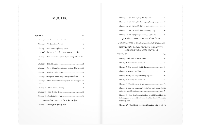 PHẦN I – DIỄN TẢ ĐƠN GIẢN CỦA NGOẠI TÍNH MỘT CÁCH TỔNG QUÁT (QUYỂN II) QUYỂN II Chương 1 – Đề xuất kế hoạch xử lý …………………………………. 54 Chương 2 – Các quy tắc khác nhau………………………………… 57 Chương 3 – Quy tắc xử lý Sự lấp lửng……………………………… 61 Chương 4 – Các quy tắc khác nhau………………………………… 65 Chương 5 – Quy tắc xử lý lái hướng lập luận…………………… 69 Chương 6 – Các quy tắc khác nhau………………………………… 71 Chương 7 – Quy tắc rút ra từ trái ngược …………………………. 74 Chương 8 – Quy tắc rút ra từ các hình thức khác nhau của đối ngẫu, các loại đối ngẫu……………………………………………………. 78 Chương 9 – Quy tắc rút ra từ kết hợp từ và biến đổi loại từ, từ trái ngược và từ quá trình hoặc tác nhân dẫn tới khởi sinh hoặc hủy diệt…………………………………………………………………… 81 Chương 10 – Quy tắc rút ra từ sự giống nhau giữa sự vật và tương quan của chúng, và từ mức độ khác nhau…………… 84 Chương 11 – Quy tắc lập luận (a) từ kết quả thêm sự vật đối với đặc tính của sự vật; (b) từ diễn tả phẩm tính tới đơn giản hoặc tuyệt đối………………………………………………………………… 87 PHẦN II – DIỄN TẢ (Quyển III, Chương 1-3) QUYỂN III Chương 1 – Quy tắc khác nhau; bao gồm các quy tắc rút ra từ bản nhiên của đề tài mà A hoặc B thuộc về; hoặc từ suy xét tới mục đích và cách thức Chương 2 – Quy tắc khác nhau; bao gồm các quy tắc rút ra từ sự xem xét tiền quả và hậu quả; về số lượng; về thời gian và mùa màng; về sự tự đủ; về sự hủy diệt, mất mát, trái ngược, sản sinh và đạt được; về các mẫu hình lý tưởng Chương 3 – Quy tắc khác nhau; bao gồm các quy tắc rút ra từ sự so sánh với tiêu chuẩn phổ biến nào đó; từ kết quả của thêm bớt A và B vào/khỏi thứ khác có giá trị đã biết; từ sự so sánh căn cứ mong muốn A hay B PHẦN III – DIỄN TẢ ĐƠN GIẢN CỦA GIÁ TRỊ (Quyển III, Chương 4) Chương 4 – Cách áp dụng các quy tắc ở trên PHẦN IV – DIỄN TẢ SO SÁNH CỦA NGOẠI TÍNH MỘT CÁCH TỔNG QUÁT (Quyển III, chương 5) Chương 5 – Quy tắc khác nhau Chương 6 – Cách áp dụng các quy tắc ở trên Chứng minh và phản chứng