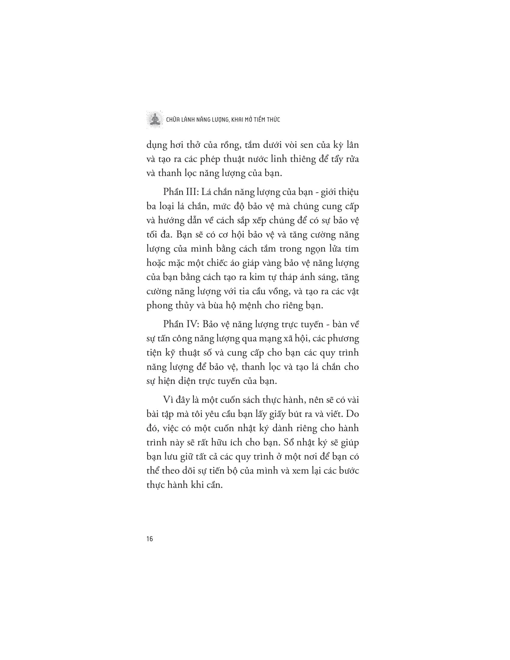 Tác giả George Lizos định nghĩa bảo vệ năng lượng là nghệ thuật duy trì suy nghĩ, cảm xúc và hành vi không bị tác động bởi môi trường xung quanh. Sách giới thiệu cách thiết lập ranh giới năng lượng rõ ràng, quản lý tương tác để giữ vững tính xác thực cá nhân. Qua đó bạn sẽ học được cách: