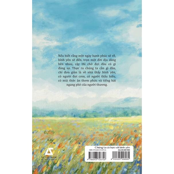 CHÚNG TA CÓ HẸN VỚI BÌNH YÊN là hành trình kiếm tìm sự yên bình sau những mối tình vỡ tan, đưa bạn đi qua những năm tháng thanh xuân từng xem một người là tất cả rồi bỗng chốc hóa hư không. Từng trang sách là những lời tâm sự, trải lòng đầy sự nuối tiếc nhưng cũng không kém phần nhẹ nhõm, kéo bạn khỏi lún sâu vào một bụi gai nhọn khi trót lỡ yêu một người không biết trân trọng mình… Bình yên chẳng ở đâu xa vời, chỉ khi bạn đã biết là đường cùng, nhất định phải quay đầu kịp lúc. Chúng ta đều xứng đáng được hạnh phúc, và sẽ hạnh phúc thôi.