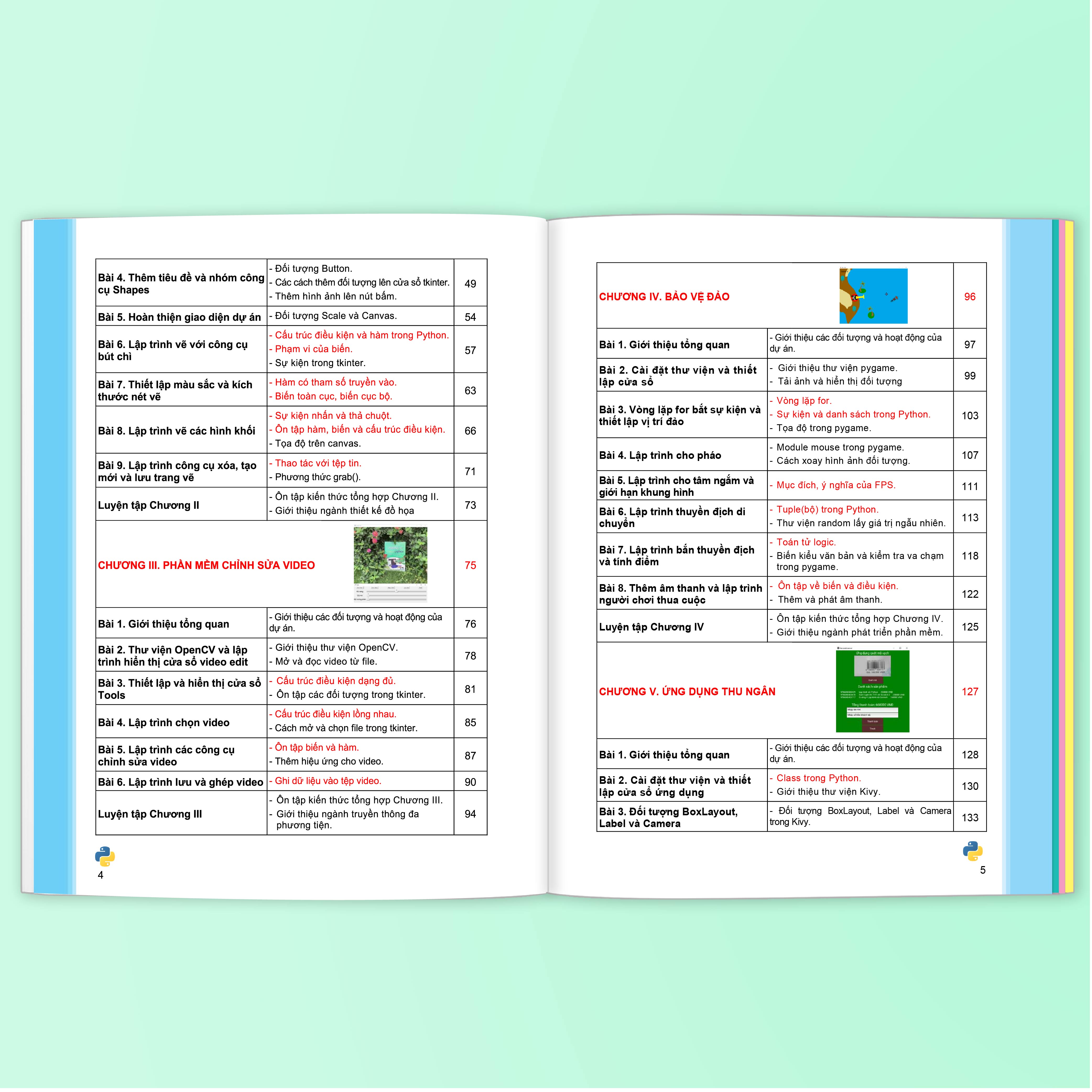 + Chương V: Biết cách đọc và lấy dữ liệu hình ảnh từ camera, phân tích và quét mã vạch từ hình ảnh cũng như trích xuất thông tin từ file và xuất thông tin ra tệp pdf. Qua đó học thêm các kiến thức về từ điển, class, tạo phương thức và nâng cao kiến thức về biến, vòng lặp, hàm, cấu trúc điều kiện, danh sách qua dự án Ứng dụng thu ngân.
