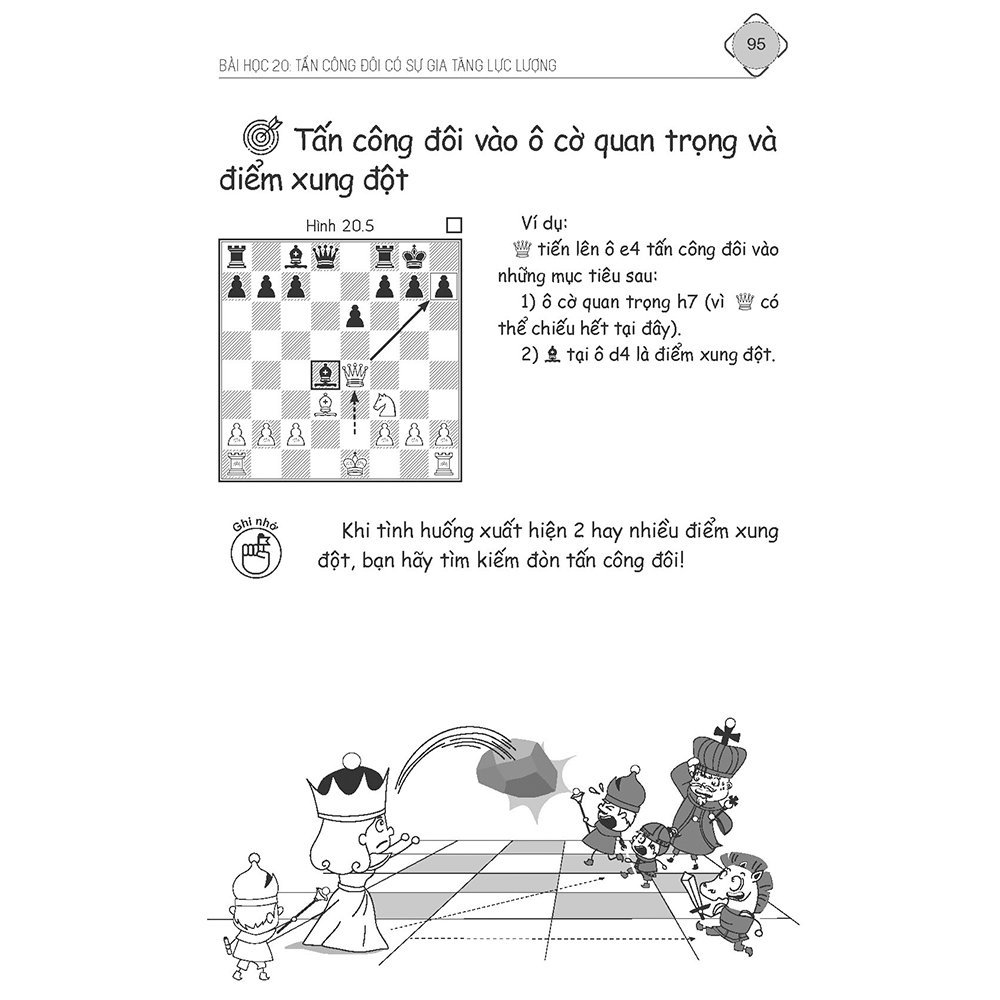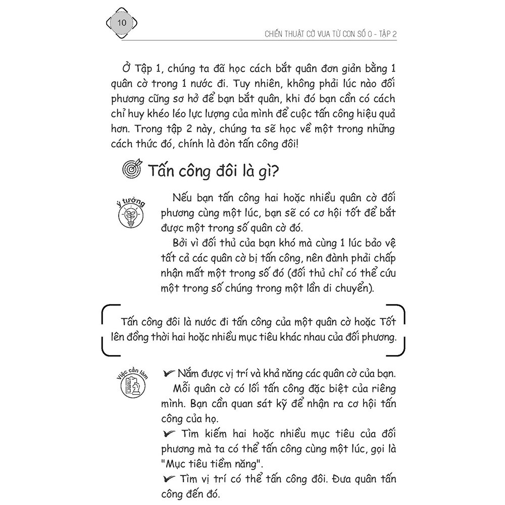 - Công ty phát hành: Công ty cổ phần Cờ vua Dương Sinh GIỚI THIỆU VỀ TẬP SÁCH "Cờ vua phần nhiều tạo bởi các tình huống chiến thuật" – đó là nhận định của các đại kiện tướng trên thế giới, cho thấy vai trò rất quan trọng của chiến thuật trong cờ vua. Theo dõi nhiều ván cờ của các kỳ thủ nhỏ tuổi tại các giải đấu cờ vua, Tôi nhận thấy rất nhiều tình huống chiến thuật bị bỏ sót, nhiều sai lầm dẫn đến thua cờ rất đáng tiếc. Nguyên nhân chủ yếu là do các kỳ thủ còn ít thực hành chiến thuật và cuốn sách này ra đời nhằm giúp các kỳ thủ dễ dàng tiếp cận, nắm bắt được chiến thuật cờ vua hơn. Trong thực tế, Chiến thuật dựa trên những thế cờ mẫu cơ bản, bạn có thể học được thông qua các thế cờ được tổ chức khoa học. Bộ sách này tập trung vào các mẫu chiến thuật điển hình, thường xuyên xảy ra trong thực tế thi đấu. Tương tự như việc luyện nghe âm thanh của người học nhạc, kỳ thủ cần luyện mắt bằng cách làm quen với các thế cờ mẫu trên bàn cờ, rồi lặp đi lặp lại, giúp ghi nhớ, phát triển tầm nhìn chiến thuật. Khi thành thạo các mẫu chiến thuật, bạn có thể tính toán, áp dụng những thế cờ mẫu đó vào ván cờ của mình. Bạn càng thực hành nhiều thì bạn càng chơi cờ tốt và càng có nhiều cơ hội giành được nhiều chiến thắng hơn. Có một bí quyết: "Học chiến thuật là một trong những cách tốt nhất để bạn trở thành kỳ thủ mạnh mẽ". Tập 1 bao gồm các nội dung căn bản về tấn công và bắt quân, cụ thể như sau: Bài học 0: Giới thiệu về chiến thuật (phần 1) Bài học 1: Bắt quân không được bảo vệ Bài học 2: Bắt quân có giá trị cao hơn Bài học 3: Lựa chọn bắt quân lợi điểm nhiều nhất Kể chuyện Cờ vua Bài học 4: Bắt quân bằng lực lượng nhiều hơn Bài học 5: Lựa chọn bắt quân bằng lực lượng nhiều hơn Kể chuyện Cờ vua Bài học 6: Tấn công quân cờ bằng cách gia tăng lực lượng Bài học 7: Tấn công quân cờ bị hạn chế hoạt động Kể chuyện Cờ vua Bài học 8: Bắt quân lợi nước đi Bài học 9: Bắt quân để phòng thủ Kể chuyện Cờ vua Bài học 10: Bắt quân đúng cách Bài test số 1 Kể chuyện Cờ vua Tập 2 bao gồm các nội dung căn bản về đòn Tấn công đôi, cụ thể như sau: Bài học 11: Giới thiệu về Tấn công đôi Bài học 12: Tấn công đôi bằng Xe Kể chuyện Cờ vua Bài học 13: Tấn công đôi bằng Tượng Bài học 14: Tấn công đôi bằng Hậu Kể chuyện Cờ vua Bài học 15: Tấn công đôi bằng Vua Bài học 16: Tấn công đôi bằng Mã Kể chuyện Cờ vua Bài học 17: Tấn công đôi bằng Tốt Bài học 18: Tấn công đôi có sự trợ giúp của đồng đội Kể chuyện Cờ vua Bài học 19: Tấn công đôi có mục tiêu là ô cờ quan trọng Bài học 20: Tấn công đôi có sự gia tăng lực lượng Kể chuyện Cờ vua Bài học 21: Phòng thủ chống lại Tấn công đôi Bài học 22: Tấn công đôi trong các ván cờ Kể chuyện Cờ vua Bài test số 2 Hai tập sách này là một phần của bộ sách gồm 6 tập, mỗi tập có các bài học chiến thuật quan trọng, giúp các kỳ thủ tiến bộ từng bước một. Bên cạnh việc hướng tới sự tự học của các kỳ thủ, nó còn giúp các huấn luyện viên có thêm công cụ hỗ trợ cho học viên của mình dễ dàng tiếp thu và thực hành chiến thuật cờ vua. Với hệ thống hình ảnh minh họa, sơ đồ các đòn chiến thuật đa dạng, cách tiếp cận xuất phát từ những ý tưởng đơn giản rồi gợi mở dần, bộ sách sẽ giúp các kỳ thủ nhí “nâng tầm” từng bước Chiến thuật Cờ vua của mình, tăng cường khả năng tư duy, giải quyết vấn đề, khám phá vẻ đẹp tiềm ẩn mang tính nghệ thuật – khoa học của Cờ vua! Bộ sách được viết bằng toàn bộ niềm đam mê của tác giả, hy vọng bộ sách sẽ giúp các kỳ thủ có bước khởi đầu đầy cảm hứng trên hành trình ngàn dặm với chiến thuật cờ vua. GIỚI THIỆU VỀ TÁC GIẢ Tác giả Phùng Đức Tường - Huấn luyện viên cờ vua Quốc tế, Hội viên Liên đoàn cờ Việt Nam, Chủ nhiệm Câu lạc bộ cờ vua Dương Sinh. Bộ sách này ra đời xuất phát từ tâm huyết của anh, với những trải nghiệm dạy cờ vua của mình cho chính các con, học sinh và những em bé tại những buổi sinh hoạt cộng đồng.