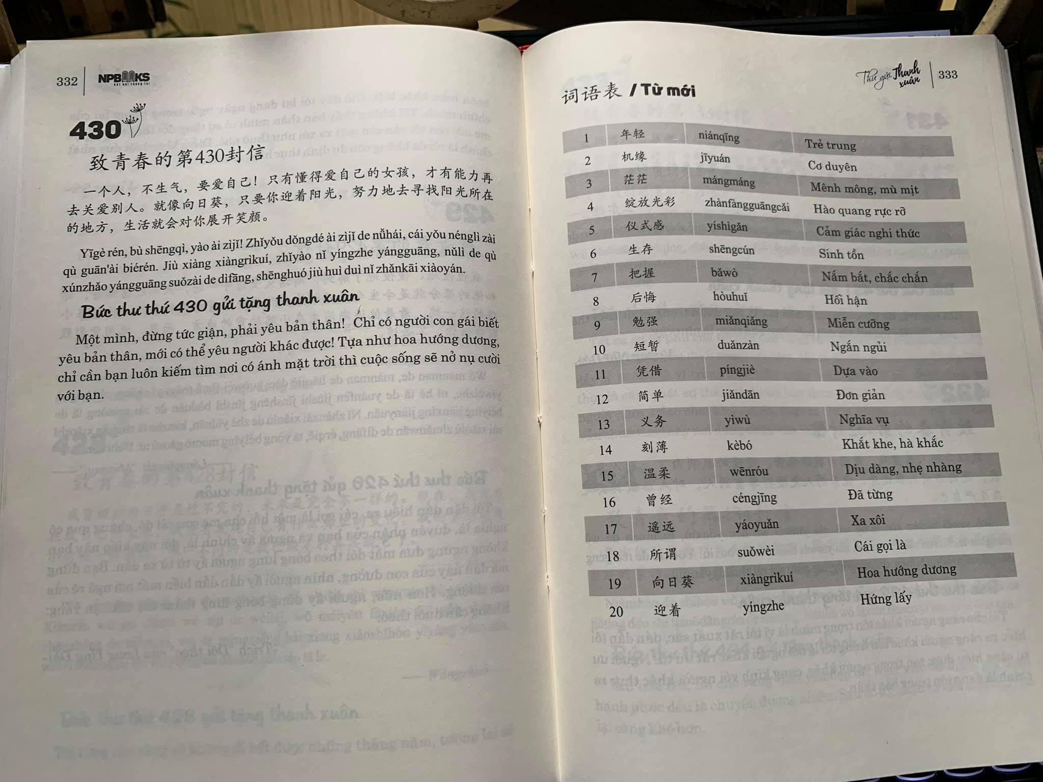Nội dung sách:Gồm những bức thư song ngữ (Trung – Việt – Pinyin) gửi tặng thanh xuân tươi đẹp
