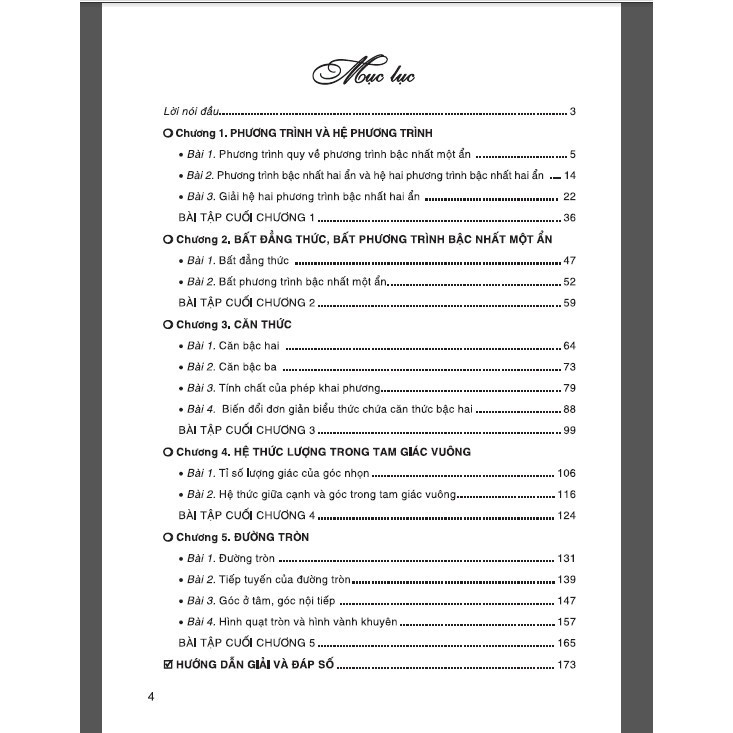 1. Nội dung sách tổng ôn toán học lớp 9 Tập 1 gồm 4 chương: - Chương 1: Căn bậc hai, căn bậc ba. - Chương 2: Hàm số bậc nhất. - Chương 3: Hệ