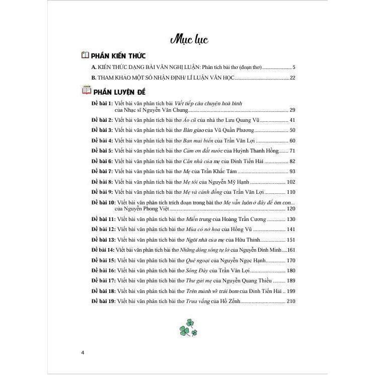 • Phần 2: Luyện đề: Giới thiệu phong phú các đề luyện về phân tích tác phẩm truyện ngoài sách giáo khoa, kèm theo dàn ý chi tiết. Tất cả các đề luyện đều được lựa chọn phù hợp với học sinh theo định hướng phát triển phẩm chất, năng lực. Với cách trình bày rõ ràng, mạch lạc, cuốn sách không chỉ là tài liệu tham khảo hữu ích cho học sinh trong quá trình tự học, ôn luyện mà còn là nguồn hỗ trợ thiết thực cho giáo viên trong giảng dạy. Với phương châm hướng dẫn học sinh cảm thụ, phân tích bám sát yêu cầu theo đặc trưng thể loại, mang tính gợi mở, cuốn sách sẽ giúp các em học sinh phát huy được tư duy, không rập khuôn máy móc mà khuyến khích khả năng sáng tạo. Tác giả hi vọng cuốn sách sẽ được thầy cô và các em học sinh đón nhận rộng rãi. Trong quá trình biên soạn, cuốn sách không tránh khỏi những thiếu sót, rất mong nhận được những ý kiến đóng góp của bạn đọc gần xa, đặc biệt là quý thầy cô và các em học sinh thân yêu để cuốn sách được hoàn thiện hơn trong lần tái bản.