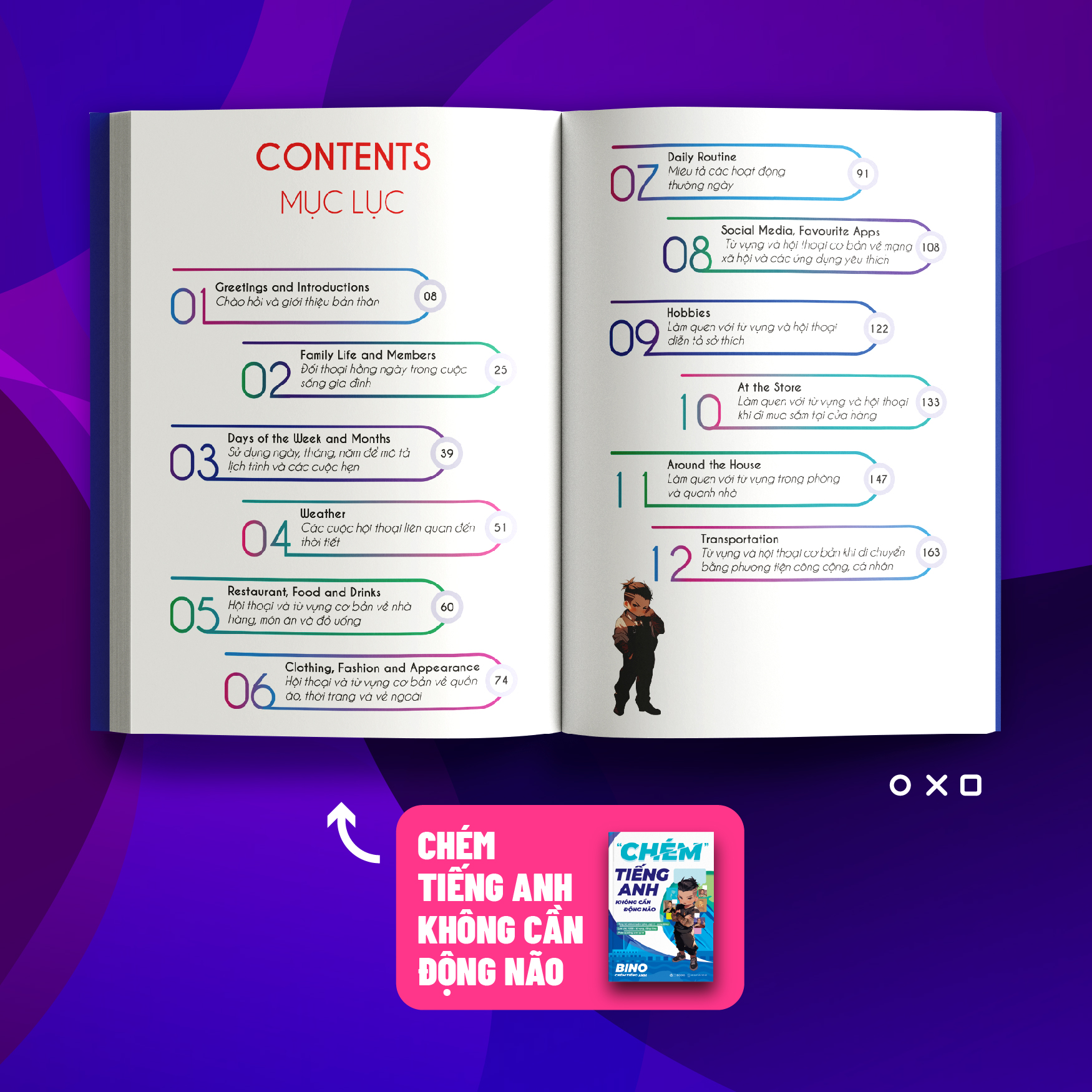 Chém Tiếng Anh Không Cần Động Não của tác giả Bino (Vũ Vi Bình), chủ kênh TikTok @binochemtienganh với hơn 750.000 người theo dõi, là cuốn sách luyện nói tiếng Anh thực tiễn, giúp người học vượt qua rào cản giao tiếp. Tác giả chỉ ra rằng nhiều người Việt biết tiếng Anh nhưng không nói được do phương pháp giáo dục truyền thống thiếu tính thực tế và luyện tập. Cuốn sách cung cấp hơn 500 mẫu câu thuộc 12 chủ đề thiết thực, kèm video luyện nghe-nói 1:1, giúp người học nói tiếng Anh tự nhiên như người bản xứ.