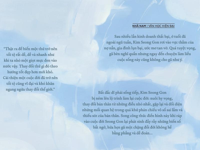 Năm phát hành: 2024 GIỚI THIỆU SÁCH Sau nhiều lần kinh doanh thất bại, ở tuổi đã ngoài ngũ tuần, Kim Seong Gon rơi vào vực thẳm của nợ nần, gia đình lụn bại, ước mơ tan vỡ. Quá tuyệt vọng, gã bèn nghĩ quẩn nhưng ngay đến chuyện làm liều cuộc sống này cũng không cho gã như ý. Bất đắc dĩ phải sống tiếp, Kim Seong Gon bị ném lên lộ trình làm lại cuộc đời: nuôi hy vọng, thay đổi bản thân từ những điều nhỏ nhất, gặp lại và đối diện những mối quan hệ trong quá khứ phản chiếu vô số sai lầm và thiếu sót của bản thân. Song công thức điển hình này khi ráp vào cuộc đời Seong Gon lại phát sinh đầy rẫy những biến số bất ngờ, hứa hẹn gã một chặng đổi đời không hề bằng phẳng và dễ đoán...