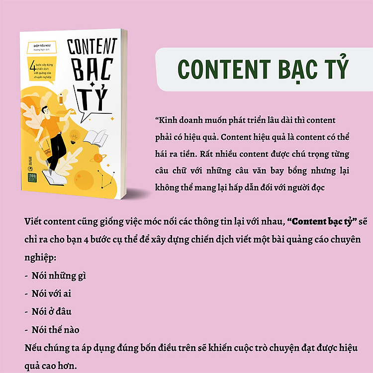 Kinh doanh muốn phát triển lâu dài thì content phải có hiệu quả. Content hiệu quả là content có thể hái ra tiền. Rất nhiều content được chú trọng từng câu chữ với những câu văn bay bổng nhưng lại không thể mang lại hấp dẫn đối với người đọc. Viết content cũng giống việc móc nối các thông tin lại với nhau, “Content bạc tỷ” sẽ chỉ ra cho bạn 4 bước cụ thể để xây dựng chiến dịch viết một bài quảng cáo chuyên nghiệp: “Nói những gì – Nói với ai – Nói ở đâu – Nói thế nào”. Nói một cách dễ hiểu hơn thì chính là xem khách hàng là đối tượng để tán gẫu, chúng ta áp dụng đúng bốn điều trên sẽ khiến cuộc trò chuyện đạt được hiệu quả cao hơn.
