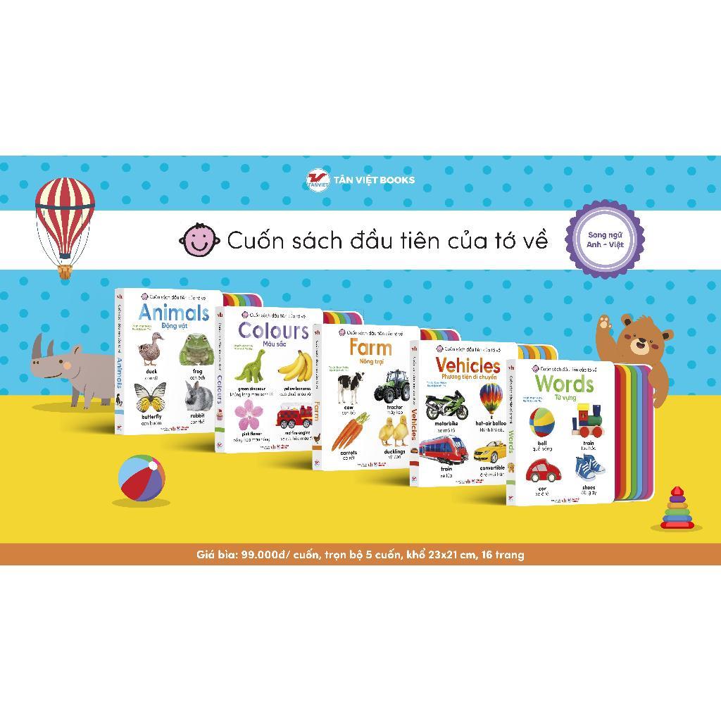 Sách - Cuốn Sách Đầu Tiên Của Tớ Về - Song Ngữ Anh - Việt Cuốn sách đầu tiên của tớ về là một bộ sách song ngữ Anh-Việt vô cùng đáng yêu, thú vị và đầy thiết thực bao gồm những chủ đề gần gũi, thân thuộc với bé. Bộ sách bao gồm 5 cuốn: Animals – Động vật: Cuốn sách song ngữ Anh-Việt này cung cấp rất nhiều từ vựng đơn giản liên quan đến động vật, từ thú cưng, bò sát, vật nuôi trong trang trại cho đến động vật dưới đại dương hay động vật sống ở vùng cực. Colours – Màu sắc: Cuốn sách song ngữ Anh-Việt này cung cấp rất nhiều từ vựng đơn giản liên quan đến 7 màu sắc cơ bản (đỏ, cam, vàng, xanh lá, xanh da trời, xám và hồng). Bên cạnh đó, bé còn được làm quen và nhận biết nhiều đồ vật, phương tiện, các loài động - thực vật bé dễ dàng bắt gặp trong cuộc sống. Words – Từ vựng: Cuốn sách song ngữ Anh-Việt này cung cấp rất nhiều từ vựng về đa dạng các chủ đề như thức ăn, phương tiện giao thông, động vật, thiên nhiên, trang phục bé thường mặc, đồ chơi… Vehicles – Phương tiện giao thông: Cuốn sách song ngữ Anh-Việt này cung cấp rất nhiều từ vựng liên quan đến các phương tiện di chuyển thân thuộc, từ những loại xe ô tô như mui trần, xe đua, siêu xe cho đến các loại xe ưu tiên, các phương tiện đường sắt hay phương tiện trên không. Farm – Nông trại: Cuốn sách song ngữ Anh-Việt này cung cấp rất nhiều từ vựng liên quan đến nông trại. Các bé sẽ vừa được làm quen với những loài động vật đáng yêu, những nông cụ quen thuộc cho đến các loại trái cây và rau củ, hay các phương tiện máy móc mà người nông dân thường sử dụng. Cuối mỗi trang sách sẽ là một câu hỏi ứng dụng để người lớn (thầy cô, cha mẹ…) có thể hỏi bé, từ đó vừa giúp bé ghi nhớ và ôn luyện lại những từ vựng đã học, vừa mở rộng vốn hiểu biết và thế giới quan của bé. Thông qua bộ sách này, các bạn nhỏ sẽ được trau dồi nhiều vốn từ vựng hơn, rèn luyện kĩ năng phát âm và nói (cả tiếng Anh và tiếng Việt), đồng thời gắn kết các thành viên trong gia đình với nhau thông qua những giờ vừa học vừa chơi vui vẻ. Với những hình ảnh sinh động và từ vựng chú thích đơn giản, bộ sách sẽ giúp các bé phát triển ngôn ngữ và rèn luyện kĩ năng nói một cách hiệu quả. Bộ sách chắc chắn sẽ là người bạn hữu ích, tuyệt vời trong những năm tháng đầu đời khi bé bắt đầu hành trình khám phá thế giới.