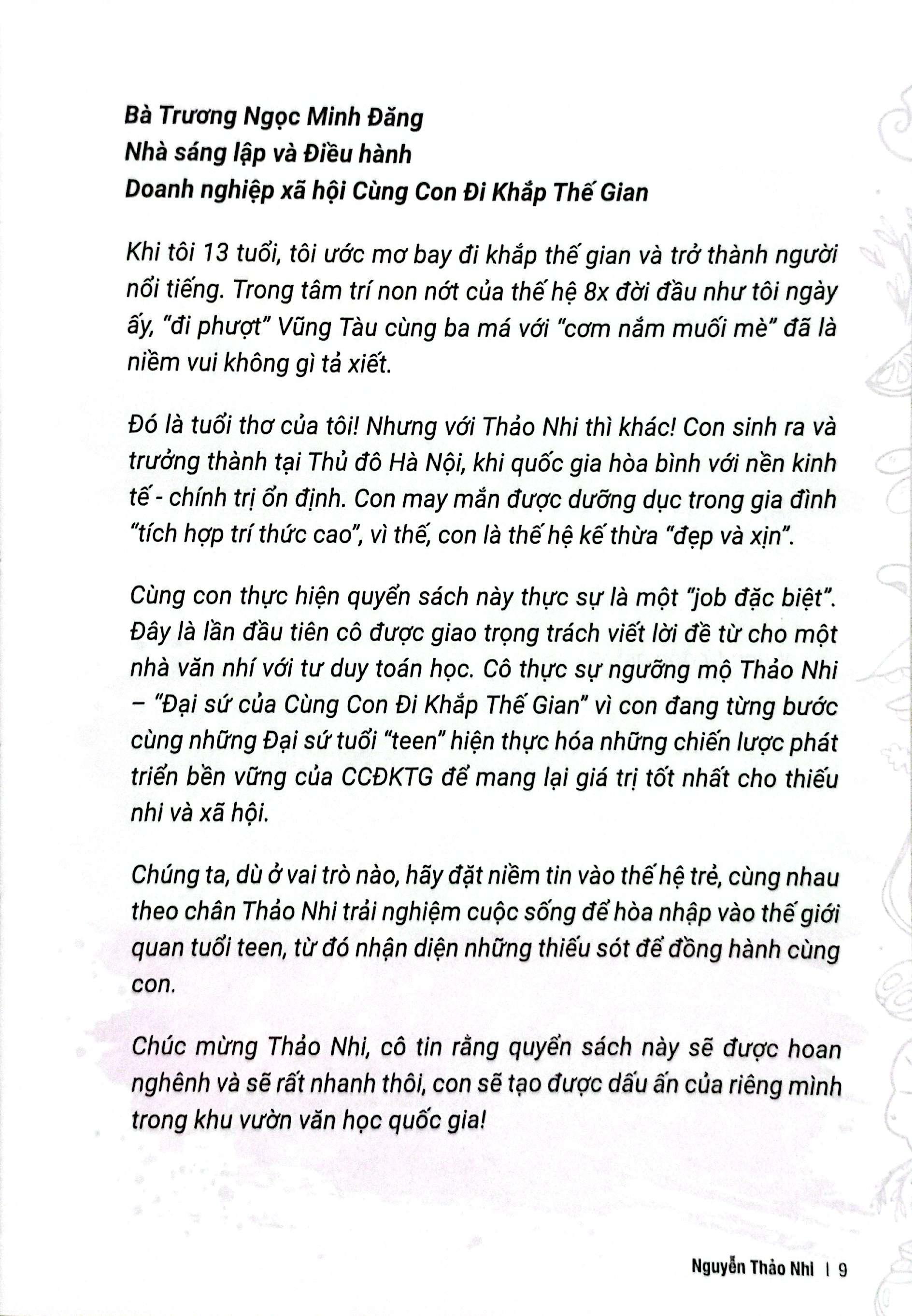 Cùng con thực hiện quyển sách này thực sự là một “job đặc biệt”. Đây là lần đầu tiên cô được giao trọng trách viết lời đề từ cho một nhà văn nhí với tư duy toán học. Cô thực sự ngưỡng mộ Thảo Nhi – “Đại sứ của Cùng Con Đi Khắp Thế Gian” vì con đang từng bước cùng những Đại sứ tuổi “teen” hiện thực hóa những chiến lược phát triển bền vững của CCĐKTG để mang lại giá trị tốt nhất cho thiếu nhi và xã hội.