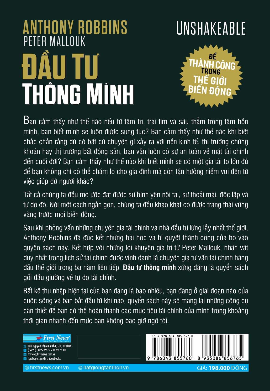 Nhà xuất bản: Dân Trí Tác giả: Anthony Robbins & Peter Mallouk Số trang: 368 trang Khổ sách: 14,5 x 20,5cm Quy cách in: bìa mềm, tay gấp, có hiệu ứng Giá bìa: 198.000 VNĐ                                                      ĐẦU TƯ THÔNG MINH                                          Để thành công trong thế giới biến động Quyển sách cho thấy hành trình tự chuẩn bị của 50 bậc thầy trong ngành tài chính, cách họ kiếm lợi nhuận qua việc dự đoán thời điểm và mức độ khắc nghiệt của “mùa đông lạnh lẽo’’ trên thị trường. Bằng cách này, họ có thể hưởng lợi từ những biến động của thị trường tài chính - chứng khoán thay vì chịu thiệt hại như những người chỉ thụ động phản ứng với nó. Đa số chúng ta đều mơ ước đạt được sự thoải mái, độc lập và tự do tài chính. Tuy nhiên, lòng tham và sự thiếu kiên nhẫn là những yếu tố có thể cản trở chúng ta đạt được ước mơ này, cụ thể là cản trở hành trình đầu tư tài chính, thứ có thể đưa chúng ta đến với tự do tài chính. Bạn không bao giờ biết thị trường sẽ biến động như thế nào, nhưng sự không chắc chắn đó không phải là cái cớ để bạn không hành động. Trong “Đầu tư thông minh”, tác giả Anthony Robins cùng với chuyên gia tài chính Peter Mallouk sẽ cho bạn thấy, bạn có thể ứng phó với sự biến động của thị trường bằng cách tự nâng cao kiến thức, nghiên cứu các mô hình dài hạn, cũng như mô phỏng kinh nghiệm của các nhà đầu tư xuất sắc nhất để đưa ra những quyết định hợp lý. Anthony Robbins đã thể hiện tài năng độc đáo của mình trong việc biến những điều phức tạp trở nên đơn giản khi chắt lọc tư tưởng của những nhà đầu tư xuất sắc nhất thế giới thành những bài học thực tế mang lại lợi ích cho cả những nhà đầu tư mới vào nghề lẫn những chuyên gia sành sỏi. Quyển sách được trình bày ngắn gọn, giàu tri thức với văn phong súc tích và rành mạch. Bằng sự tinh tế và hiểu biết sâu sắc, Anthony Robbins đã bao quát những rủi ro và tỷ suất sinh lợi từng phát sinh trong lịch sử đầu tư để từ đó tạo nên các dữ kiện và chiến lược thiết yếu mà bạn cần để thay đổi cuộc sống tài chính của mình. Khi hiểu được những điều này, bạn sẽ có thể nhận ra các mùa tài chính hoạt động như thế nào. Bạn sẽ biết luật chơi – các quy tắc tạo nên cuộc chơi tài chính. Chính sự hiểu biết này sẽ mang lại cho bạn một lợi thế lớn, vì khi được trang bị đầy đủ kiến thức, bạn có thể tham gia cuộc chơi, bám trụ và giành chiến thắng. Trên hết, những sự thật này sẽ giải phóng bạn khỏi mọi nỗi sợ hãi và bất an đang chi phối cuộc sống tài chính của hầu hết mọi người. Cùng với “Đường đến tự do” (The Path), quyển sách này nằm trong bộ đôi tác phẩm của Anthony  Robbins về đề tài phát triển bản thân thông qua tự do tài chính. Trong “Đầu tư thông minh”, tác giả đã giới thiệu những ý kiến sâu sắc từ những nhân vật quan trọng nhất trong giới đầu tư như Warrant Buffet và giám đốc quỹ tài trợ Yale David Swensen. Cả Warren và David đều nhấn mạnh rằng quỹ chỉ số là cách tốt nhất để các nhà đầu tư tối đa hóa cơ hội đầu tư thành công. Và quyển sách này sẽ giúp thông điệp đó đến được với nhiều nhà đầu tư hơn nữa. “Đầu tư thông minh” được chia thành 3 phần: phần đầu đề cập đến các quy tắc cơ bản để làm giàu và đạt được thành công tài chính, cũng như để thật sự hiểu cách vận hành của hệ thống tài chính ngày nay; phần thứ hai là cẩm nang thực hành đầu tư tài chính với bốn nguyên tắc cốt lõi được đúc kết từ phương pháp kiếm tiền của hơn 50 nhà đầu tư vĩ đại trên thế giới. Và trong phần cuối của cuốn sách, Anthony sẽ hướng dẫn chúng ta cách tự điều chỉnh hành vi và tránh những sai lầm phổ biến do cảm xúc chi phối. Ông đã cẩn thận chỉ cho mọi người cách làm chủ hành trình đầu tư của mình thay vì ngồi lo lắng bên ngoài cuộc chơi hoặc bị đánh bại vì ứng phó với sự biến động của thị trường bằng những phương pháp tai hại trong trạng thái hoảng loạn. Trong phần Phụ lục, Anthony Robbins và Peter Mallouk tiếp tục cung cấp một bảng chỉ dẫn để bạn sử dụng cùng các cố vấn chính và luật sư của mình. Danh sách những việc cần thực hiện này sẽ hướng dẫn bạn cách bảo vệ tài sản, tạo ra tài sản kế thừa và bảo vệ bạn trước những điều chưa biết. Chúng ta đang sống trong một thế giới không có gì là chắc chắn. Không chỉ đối mặt với rủi ro của những điều chúng ta biết là mình chưa biết, mà ta còn gặp rủi ro từ những điều chúng ta không biết là mình không biết. Bất kể thu nhập hiện tại của bạn đang là bao nhiêu, bạn đang ở giai đoạn nào của cuộc sống hay bắt đầu đầu tư từ khi nào, cuốn sách “Đầu tư thông minh” sẽ mang lại những công cụ cầ
